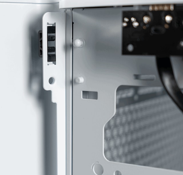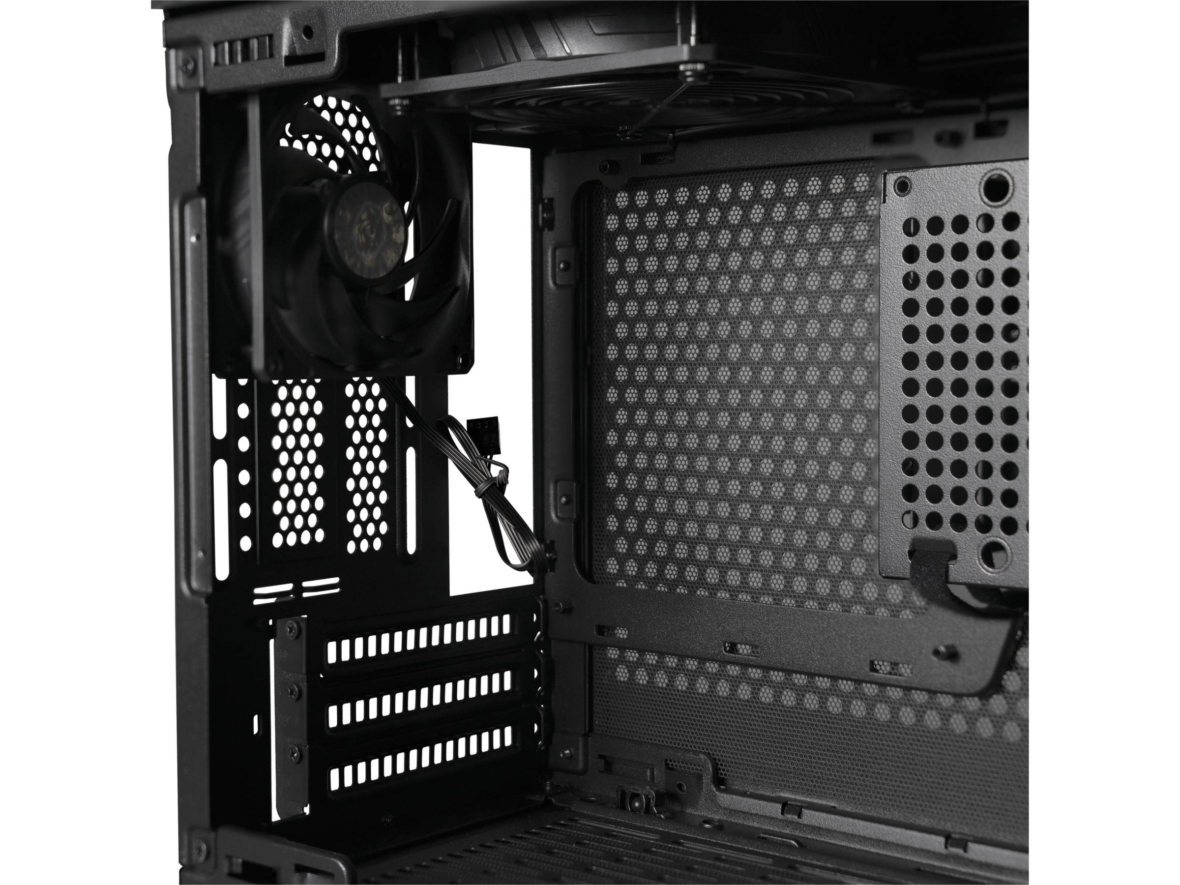 Åben ventilation og flere ventilatorbeslag bringer luftstrømmen derhen, hvor det er nødvendigt, mens generøs vandkøling og frirum til luftkøling tillader montering af kølere, der kan udnytte al luftstrømmen. Rigelig plads til lange grafikkort med tredobbelt slot betyder, at der ikke er behov for at ofre GPU-kraft for at udnytte størrelsen af lille formfaktor. Rammen er pakket ind i et slankt og smagfuldt stålchassis, der passer perfekt ind på skrivebordet