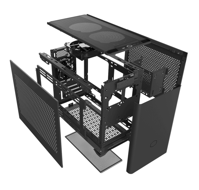 Alle paneler og rammedele i NR200-rammen kan demonteres. Skruer bruges til at fastgøre rammedelene, så avanceret demontering og arbejde fra flere vinkler inden i kabinettet bliver let.