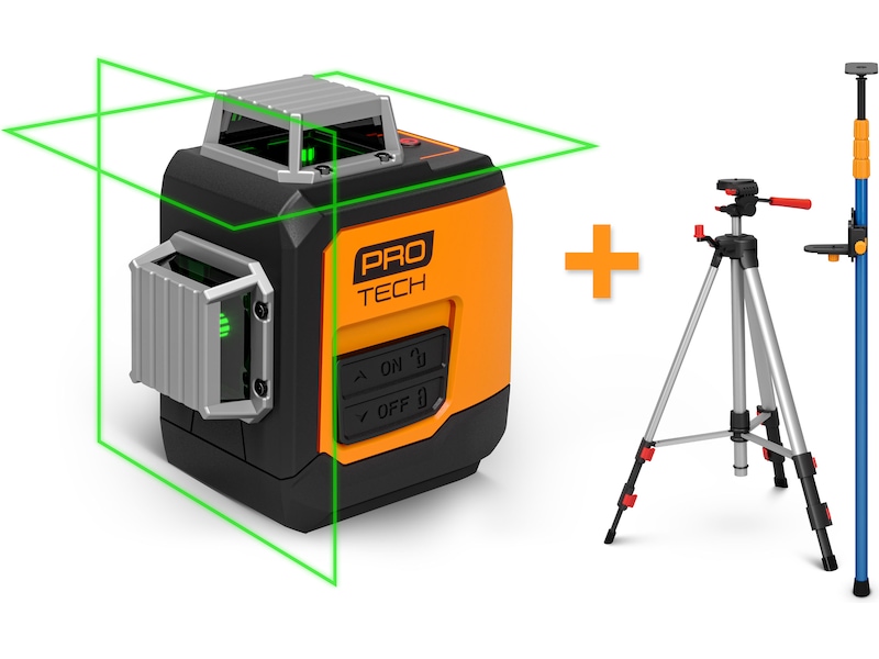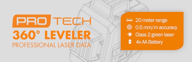 Protech 360° Cross Leveler projicerer sine linjer med stor nøjagtighed på op til ± 0,5 mm/m og sørger for, at begge linjer er præcist nivelleret og lige, hvor du vil have dem. Det tilbyder et arbejdsområde på 20 meter, og dets grønne laser giver dig høj synlighed under alle slags forhold.