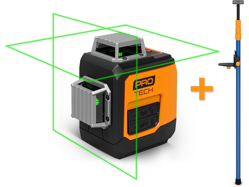 Protech 360° Cross Leveler projicerer sine linjer med stor nøjagtighed på op til ± 0,5 mm/m og sørger for, at begge linjer er præcist nivelleret og lige, hvor du vil have dem. Det tilbyder et arbejdsområde på 20 meter, og dets grønne laser giver dig høj synlighed under alle slags forhold.