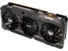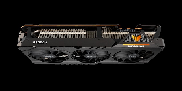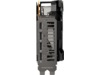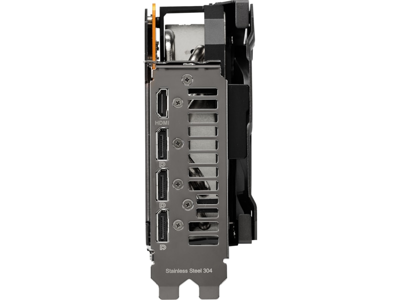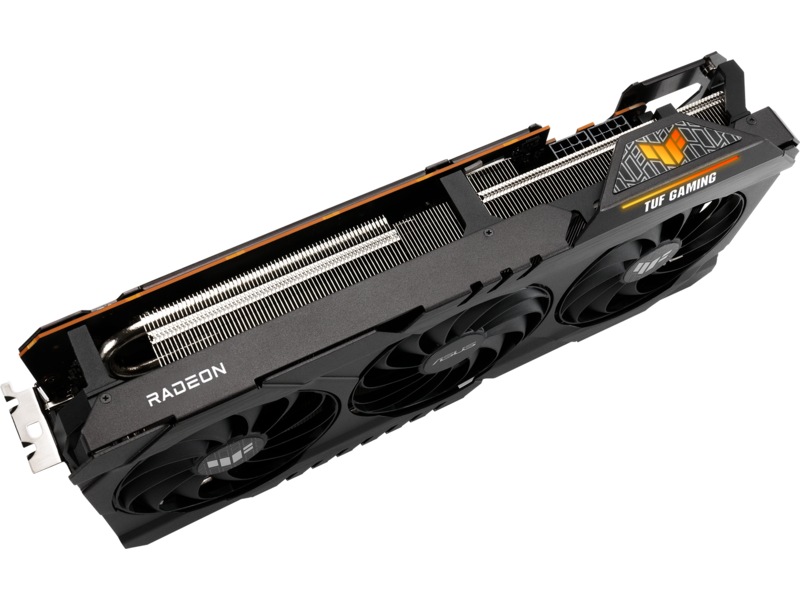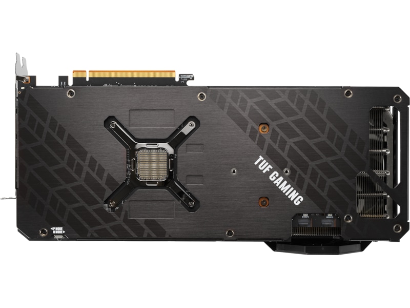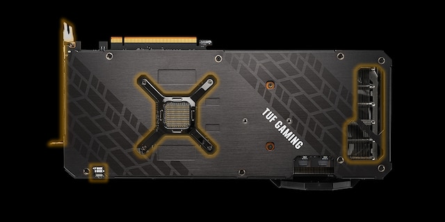 RGB-elementet på toppen kan tilpasses til at vise en række forskellige æstetiske og funktionelle effekter og kan synkroniseres med andre ASUS-komponenter for at sikre en ensartet belysning. For at opfylde strømkravene til Radeon RX 6800 XT er der to 8-pin strømstik til stede sammen med en indbygget LED, der lyser op, hvis ikke strømtilførslen er isat korrekt. Den forstærkede metalramme er også synlig her og tilføjer bogstaveligt talt et lag af rå holdbarhed.