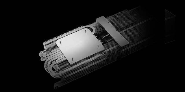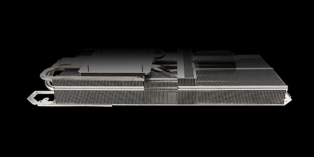 Varmesprederen fører varmen op til heatpipes, som fører varmen igennem en fin stack som en stor del af grafikkortets størrelse.