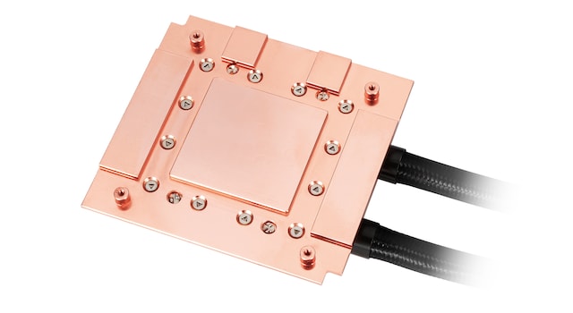 En specialdesignet plade dækker både GPU-kernerne og den indbyggede GDDR6-hukommelse, så du for alvor høster fordelene ved vandkøling.