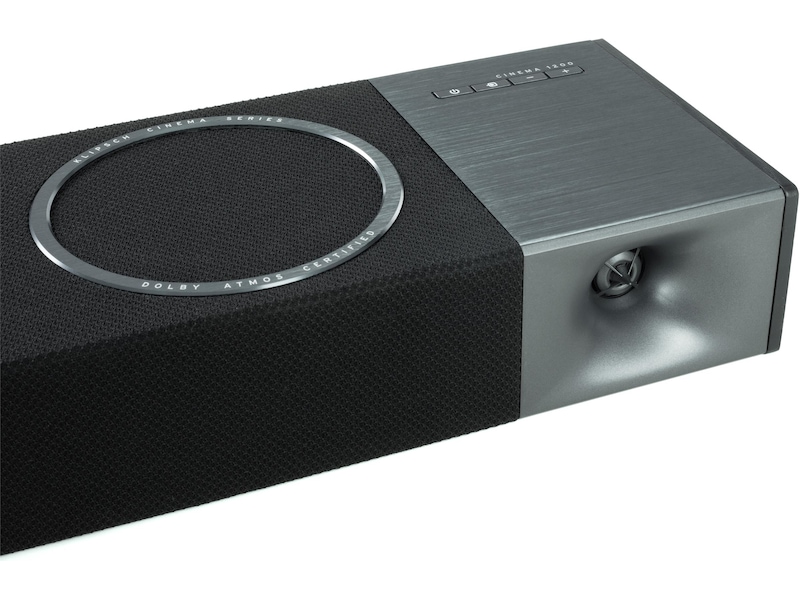 Klipsch Cinema 1200 Sound Bar har et solidt træhus til den bedst mulige lydkvalitet og er udstyret med tre integrerede tovejshøjttalere med Klipsch Tractrix tweeter og dobbelt mellemstore enheder til venstre, højre og centerkanal, trådløse surroundhøjttalere med Atmos er inkluderet.