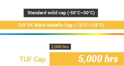 Proprietære kondensatorer giver op til 20 % større temperaturtolerance og 5X længere levetid.
