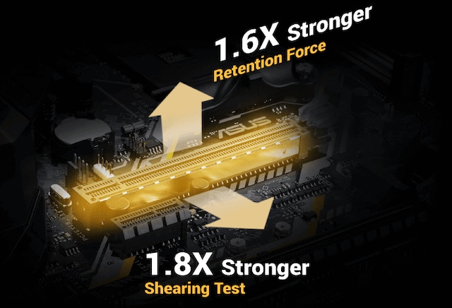 SafeSlot er den PCIe-slot, der er genopfundet af ASUS og fremstillet til at levere overlegen fastholdelse og forskydnings-modstand. SafeSlot, som er fremstillet ved hjælp af en ny indsæt-støbning, integrerer forstærkende metal for en stærkere iboende slot, som derefter er fast forankret til PCB'en gennem yderligere loddepunkter.