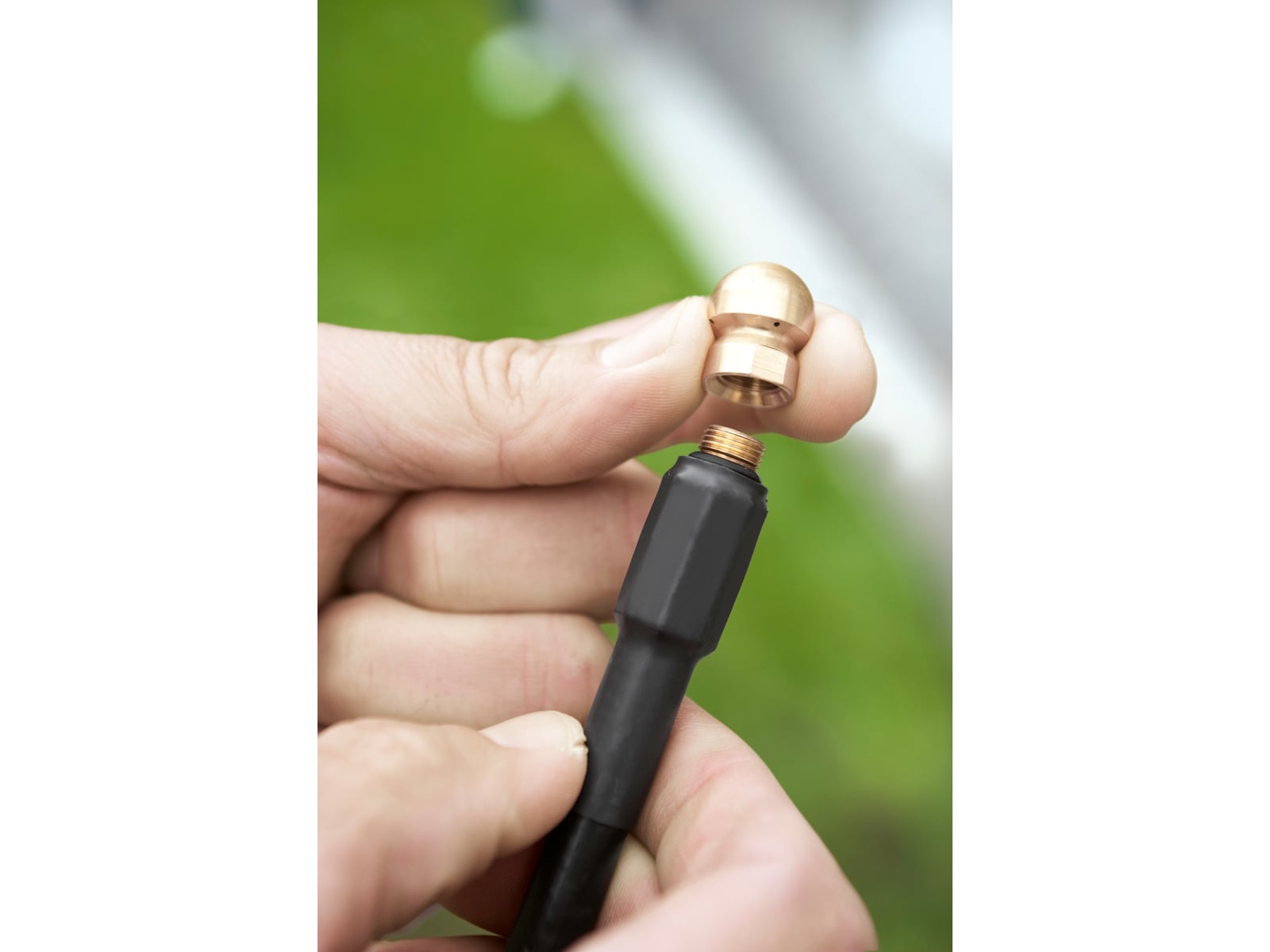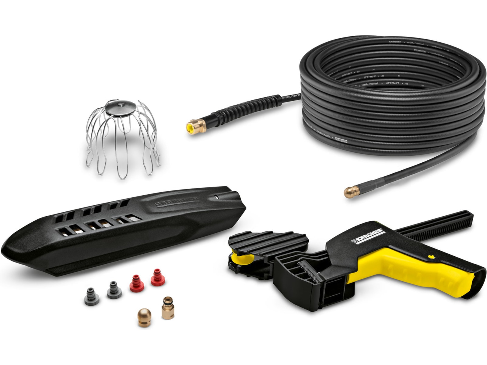 Rør- og tagrenderensesættet sikrer nem og effektiv rengøring af rør og tagrender med højt tryk.