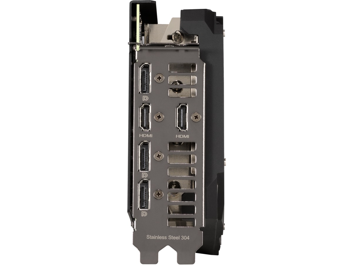 Vender du kortet om, vil du finde endnu flere forbedringer. En bred bagpladeudluftning og forkortet PCB tillader varm luft at trænge ud mod kabinettets udstødningsventilatorer i stedet for at blive genanvendt af GPU'ens cirkulerende kølingsdesign. Et GPU-beslag giver ekstra stabilitet til den kritiske forbindelse mellem matricen og varmesprederen. I/O-beslaget er lavet af rustfrit stål for at beskytte porte og for at sikre en bedre montering. En bekvemt placeret Dual Bios-switch giver hurtig mulighed for at vælge imellem "performance"- og "quiet"-tilstand i forhold til kortets tilstand - helt uden brug af software.