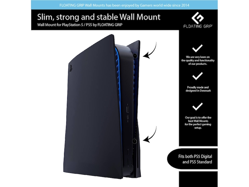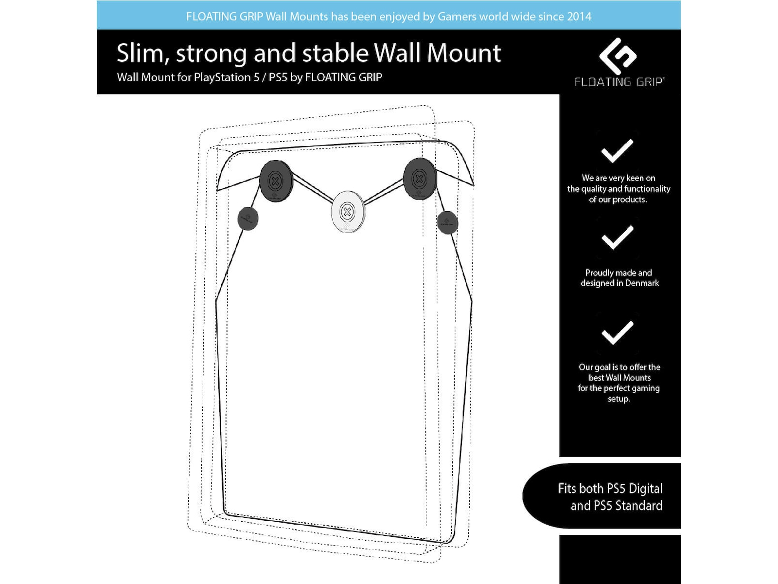 Indeholder:1x FLOATING GRIP® vægbeslag til PS5 (passer til både digital og standard diskversion)