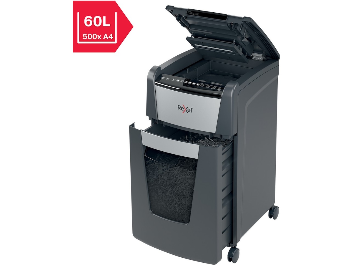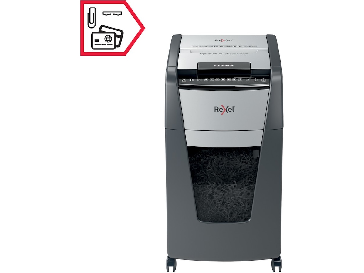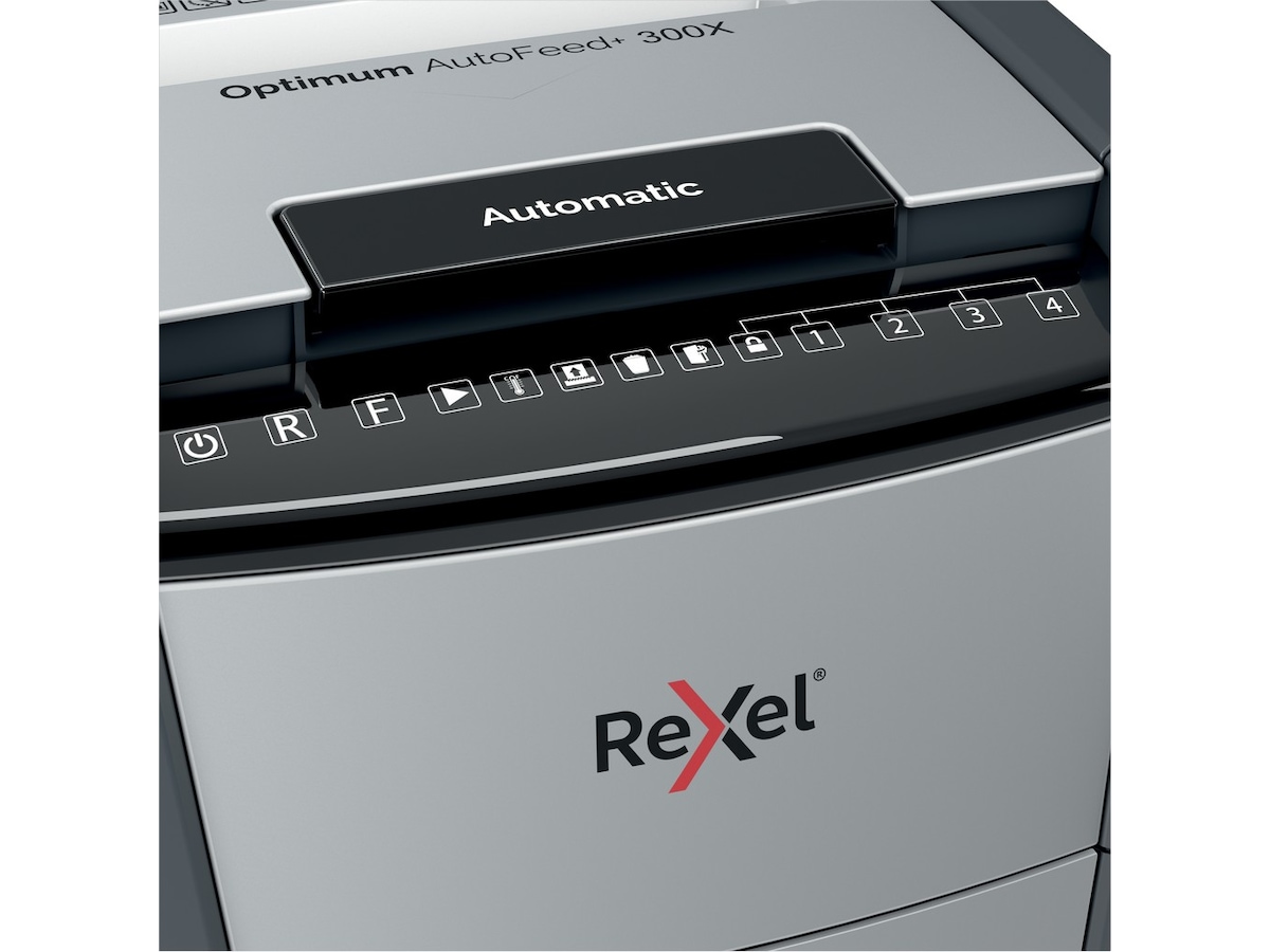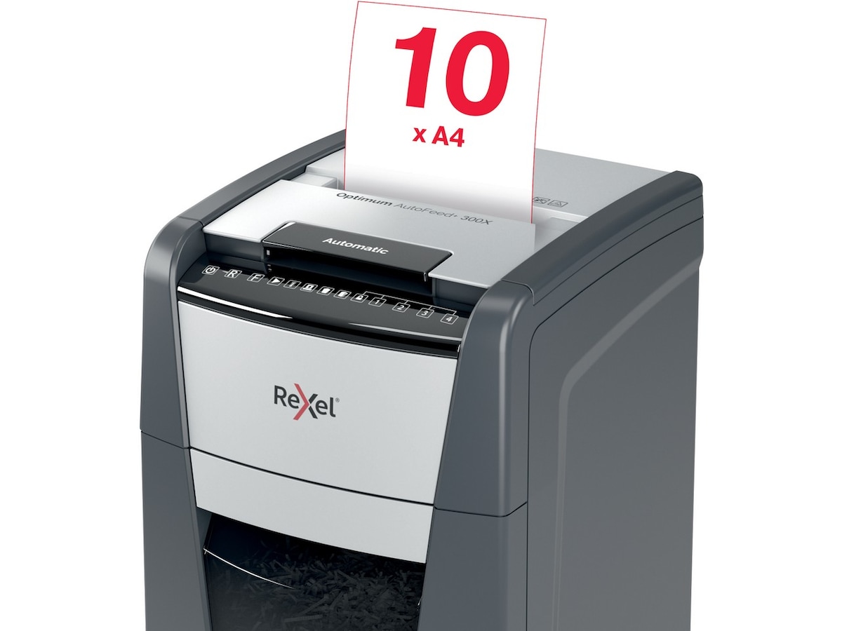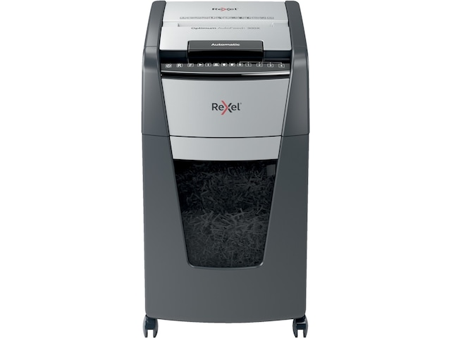 Optimum AutoFeed+ 300X krydsmakulering makuleringsmaskine makulerer automatisk op til 100 stk. A4 (80g) ark ad gangen. Makulerer med sikkerhedsniveau P-4, 4x25mm små stykker. Denne makuleringsmaskine er ideel til brug på kontoret. Den optager ikke meget plads, men har en stor makuleringskapacitet med en stor 60-liters affaldsbeholder, som nemt trækkes ud, når den skal tømmes.