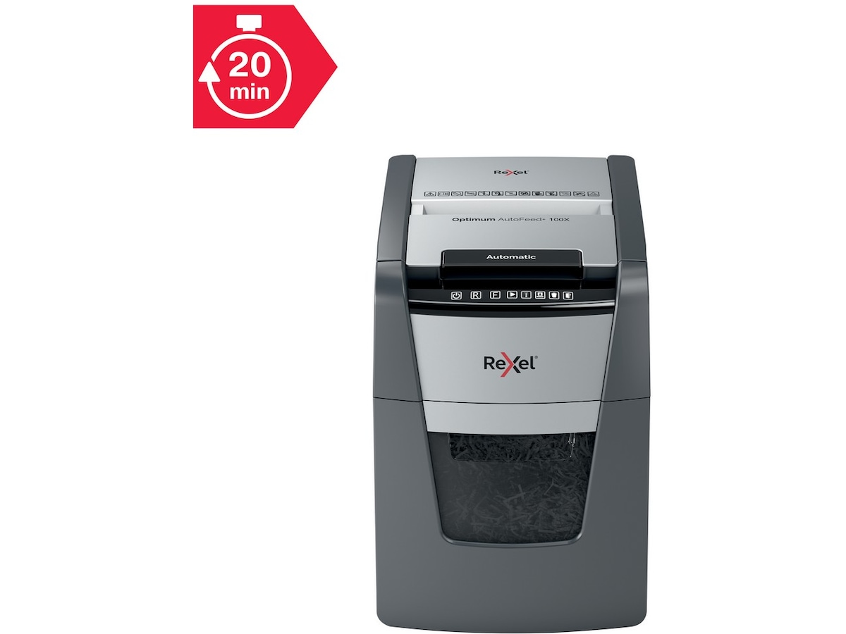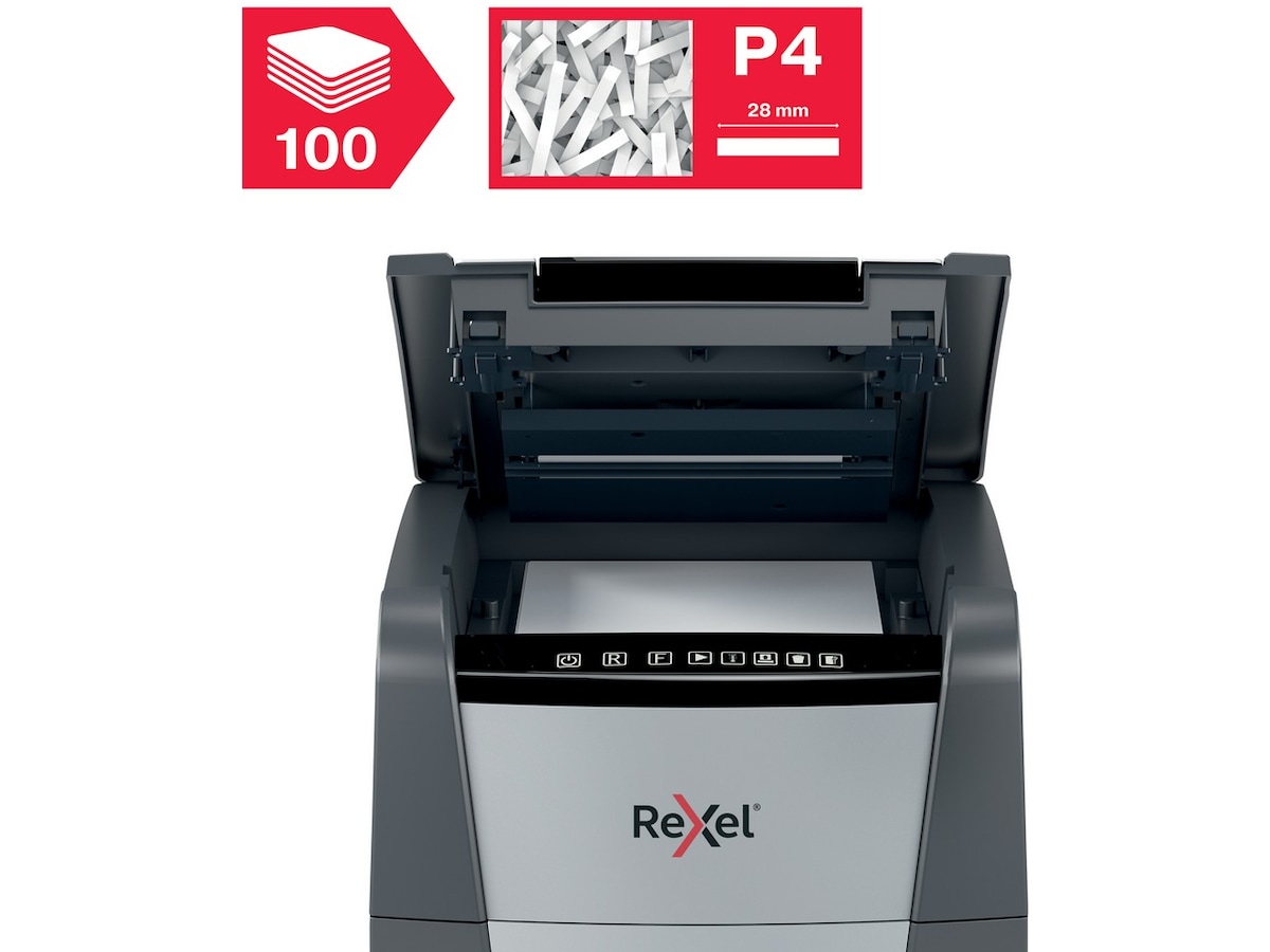 Optimum AutoFeed+ 100X krydsmakulering makuleringsmaskine makulerer automatisk op til 100 stk. A4 (80g) ark ad gangen. Makulerer med sikkerhedsniveau P-4, 4x28mm små stykker. Denne makuleringsmaskine er ideel til brug på kontoret. Den optager ikke meget plads, men har en stor makuleringskapacitet med en stor 34-liters affaldsbeholder, som nemt trækkes ud, når den skal tømmes.