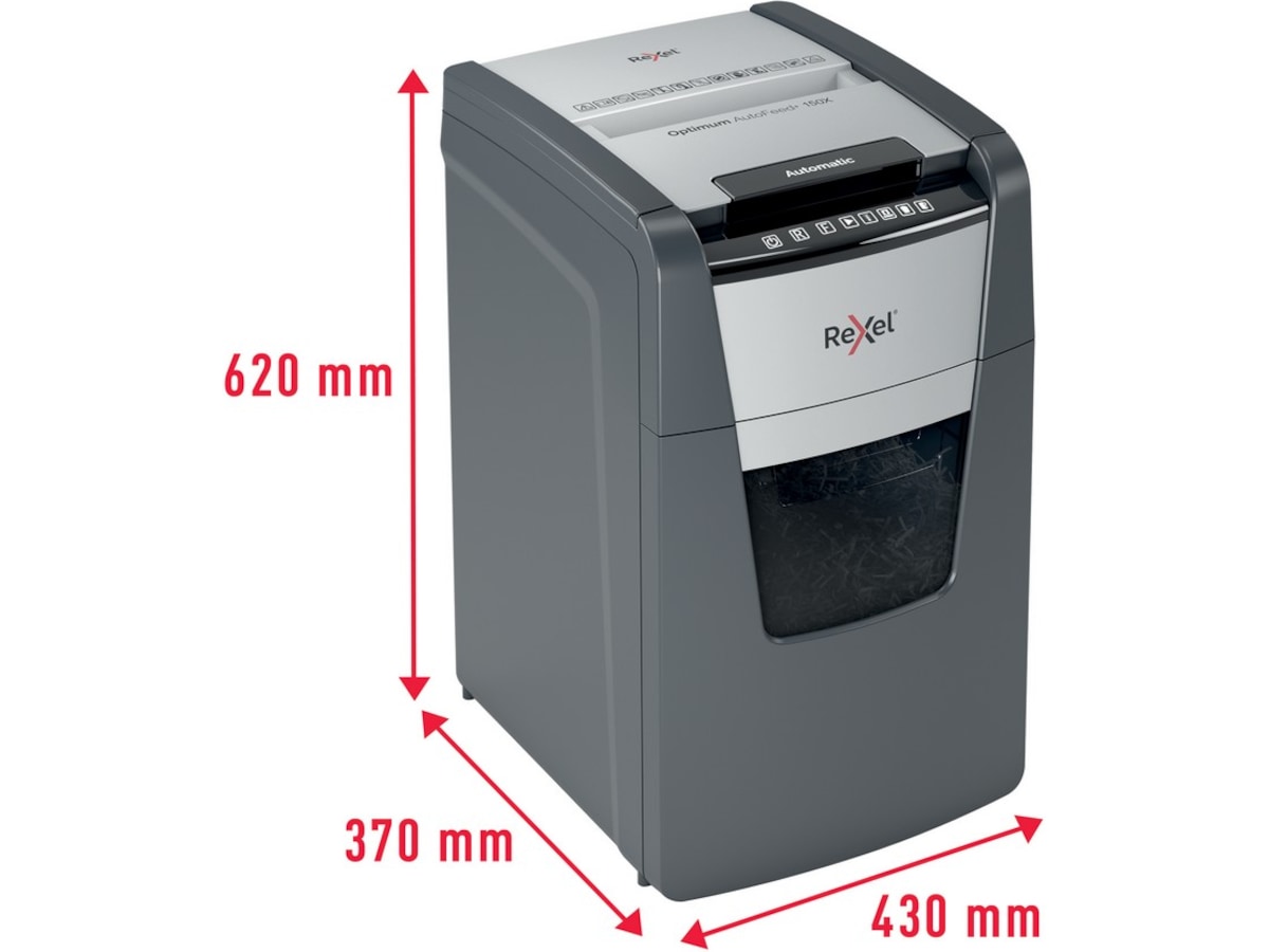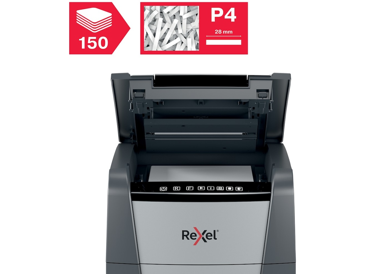 Optimum AutoFeed+ 150X krydsmakulering makuleringsmaskine makulerer automatisk op til 100 stk. A4 (80g) ark ad gangen. Makulerer med sikkerhedsniveau P-4, 4x28mm små stykker. Denne makuleringsmaskine er ideel til brug på kontoret. Den optager ikke meget plads, men har en stor makuleringskapacitet med en stor 44-liters affaldsbeholder, som nemt trækkes ud, når den skal tømmes.