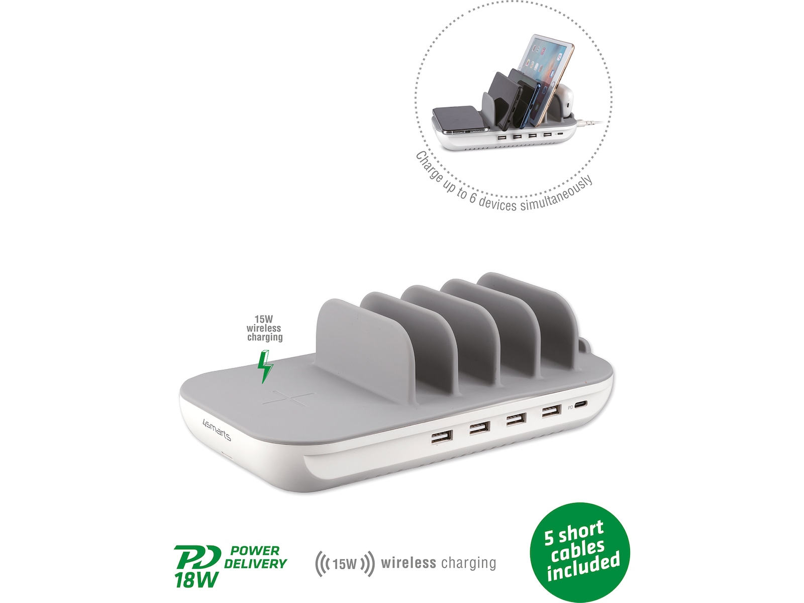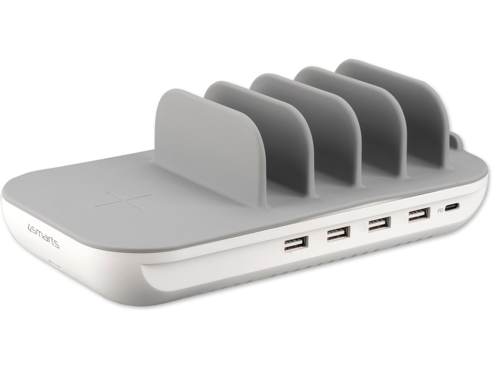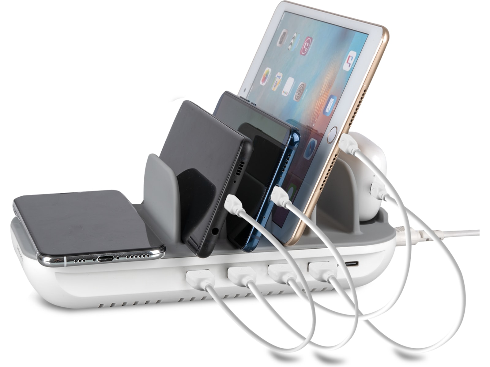 Alsidig: Oplader op til 6 enheder samtidigt. Det betyder ikke noget, om du vil oplade smartphones eller tablets. Det ekstra rum giver dig endda mulighed for at genoplade TWS-headset såsom 4smarts Skypods eller Apple Airpods i ladestationen.