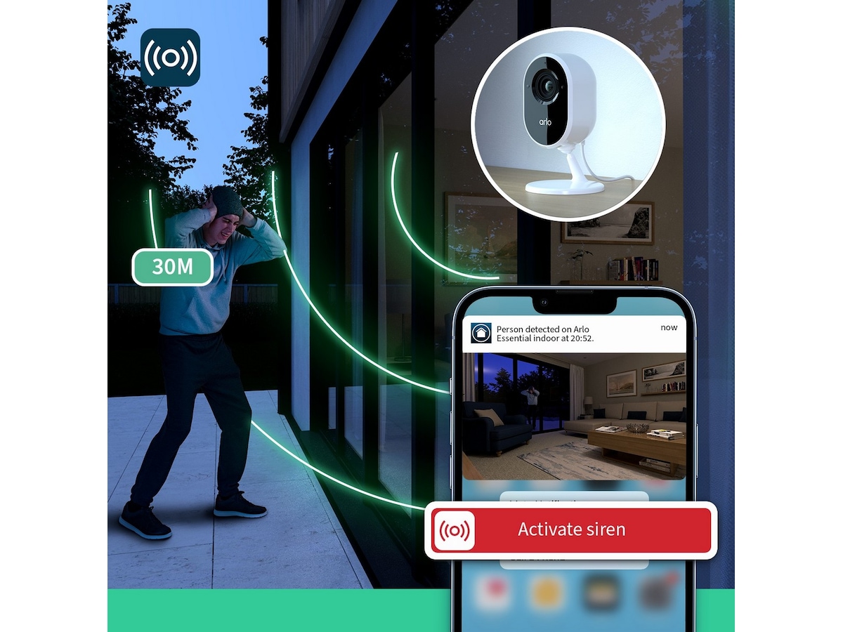 Skræm ubudne gæster væk med den indbyggede 80 db smart-sirene, der kan høres op til 30 meter væk. Få den til automatisk at gå i gang, hvis der registreres bevægelse eller udløs den fra appen for hurtigt at slå alarm.