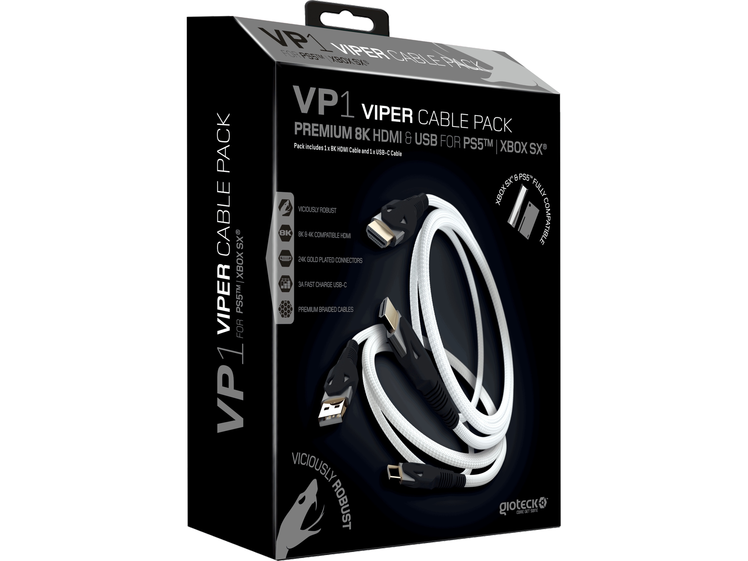 Gioteck Premium Cable Pack er en alt-i-én-løsning til den næste generation af konsoller, herunder et Viper premium USB C-kabel (3m) og et premium 2.1 8K HDMI-kabel (2m).