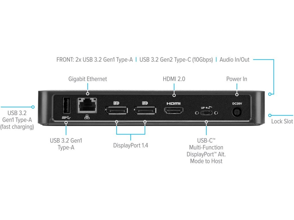 Nyd skarp, klar, naturtro video, mens der understøttes en forbindelse med op til to skærme. Med to DisplayPort 1.4-porte og en HDMI 2.0-port kan du understøtte to skærme (2560x1440 p60) eller en skærm (3840x2160 p60) og forskellige lavere opløsninger. Forbind desuden alt dit yndlingsudstyr med en kombination af USB-A (4 USB 3.2 Gen1-porte, 1 hurtigopladning) og USB-C (1x 3.2 Gen2) plus Ethernet- og lydporte.