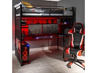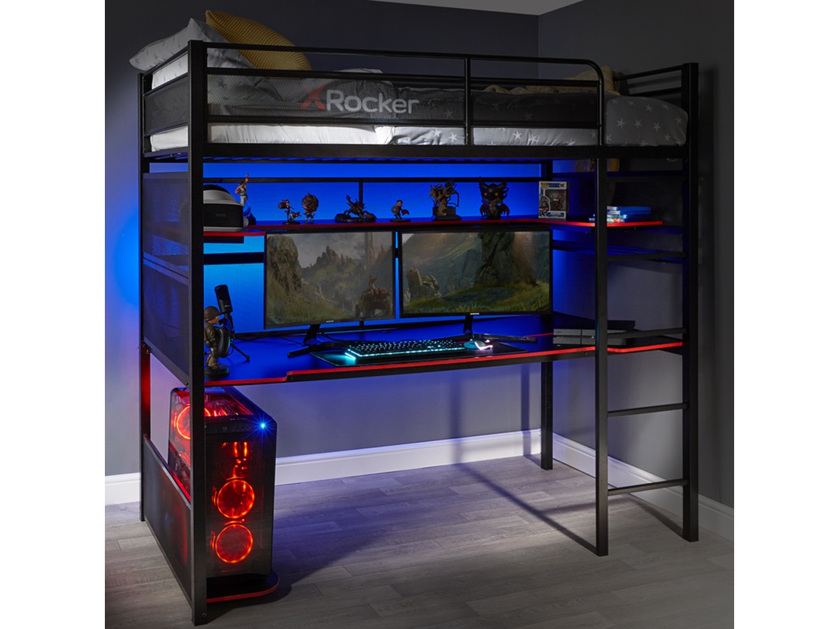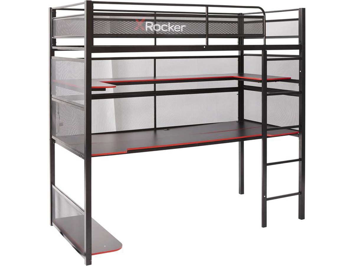 Sæt gang i noget seriøs gaming-action med denne komplet fyldte X Rocker gaming-køjeseng. Med enkeltsengen gemt væk i toppen, er der masser af plads nedenunder til flere skærme, tastaturer og en spillestol af anstændig størrelse. Gem filer og samleobjekter på de øverste hylder sammen med controllere og andet spiltilbehør. Opbevar større genstande under skrivebordet på bundhylden for at optimere din plads. Dette er en alsidig og holdbar skrivebordsseng-hybrid til gaming, der er perfekt til yngre gamere.