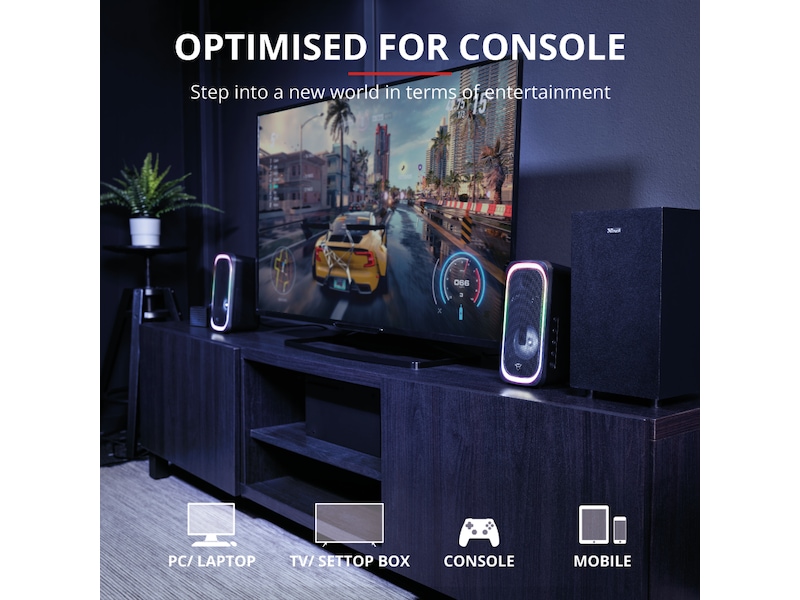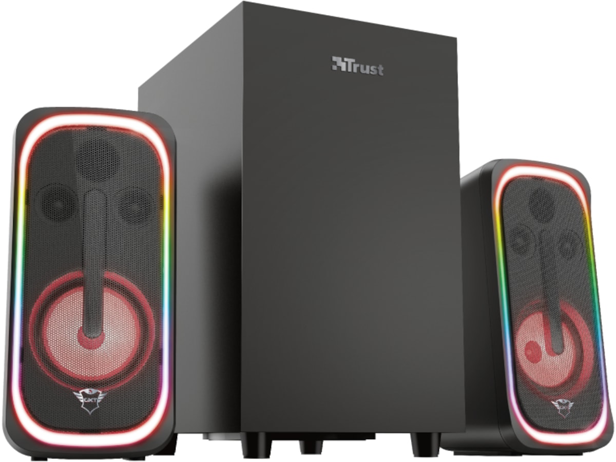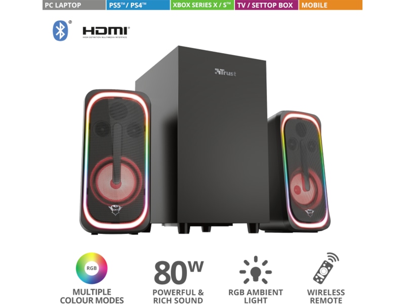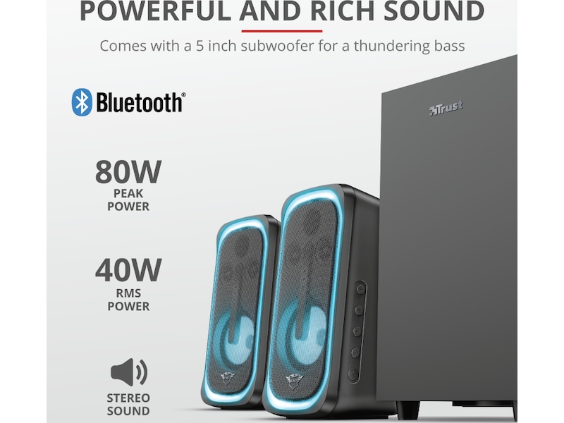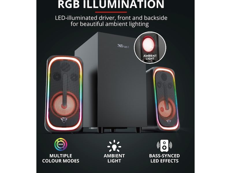 Træd ind i en ny verden af underholdning med Trust GXT 635 Rumax RGB LED Illuminated 2.1 Speaker Set. Disse stereohøjttalere leveres med en kraftig subwoofer, kan justeres efter eget ønske med hensyn til lydkvalitet og er udstyret med flere RGB-zoner for en førsteklasses lydoplevelse med flot visuel flair.
