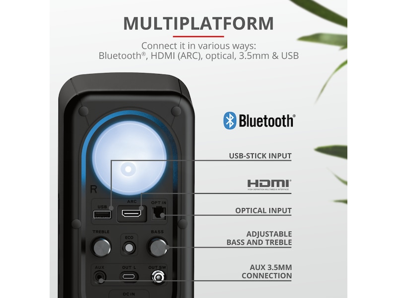 Hvorfor vælge dit højttalersæt efter hvilken forbindelse det bruger? Trust Rumax fungerer med stort set alt: HDMI ARC, optisk, 3,5 mm. Der er Bluetooth, så du kan tilslutte din telefon trådløst eller bare tilslutte et USB-flashdrev med MP3'er. Mulighederne er uendelige; tilslut Trust Rumax til din PC eller bærbare computer, din spilkonsol, dit TV eller digitalbox. Oplev en ny måde at spille spil på, se film eller lytte til musik.
