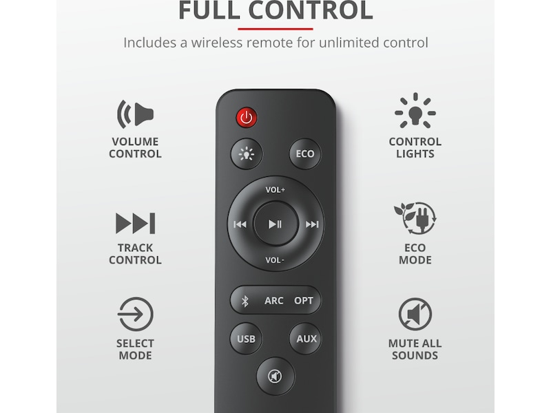 Trust Rumax leveres med en praktisk fjernbetjening, der giver dig mulighed for fuldt ud at kontrollere din musik, lydkvaliteten og lyseffekterne. Du kan justere lydstyrken og tænde for Eco-tilstand, som slukker for højttalersættet, når det ikke er i brug. Der er også kontrolknapper bag på højttaleren for at justere bas og diskant, hvis du foretrækker at bruge dem. Med Rumax har du fuld kontrol.