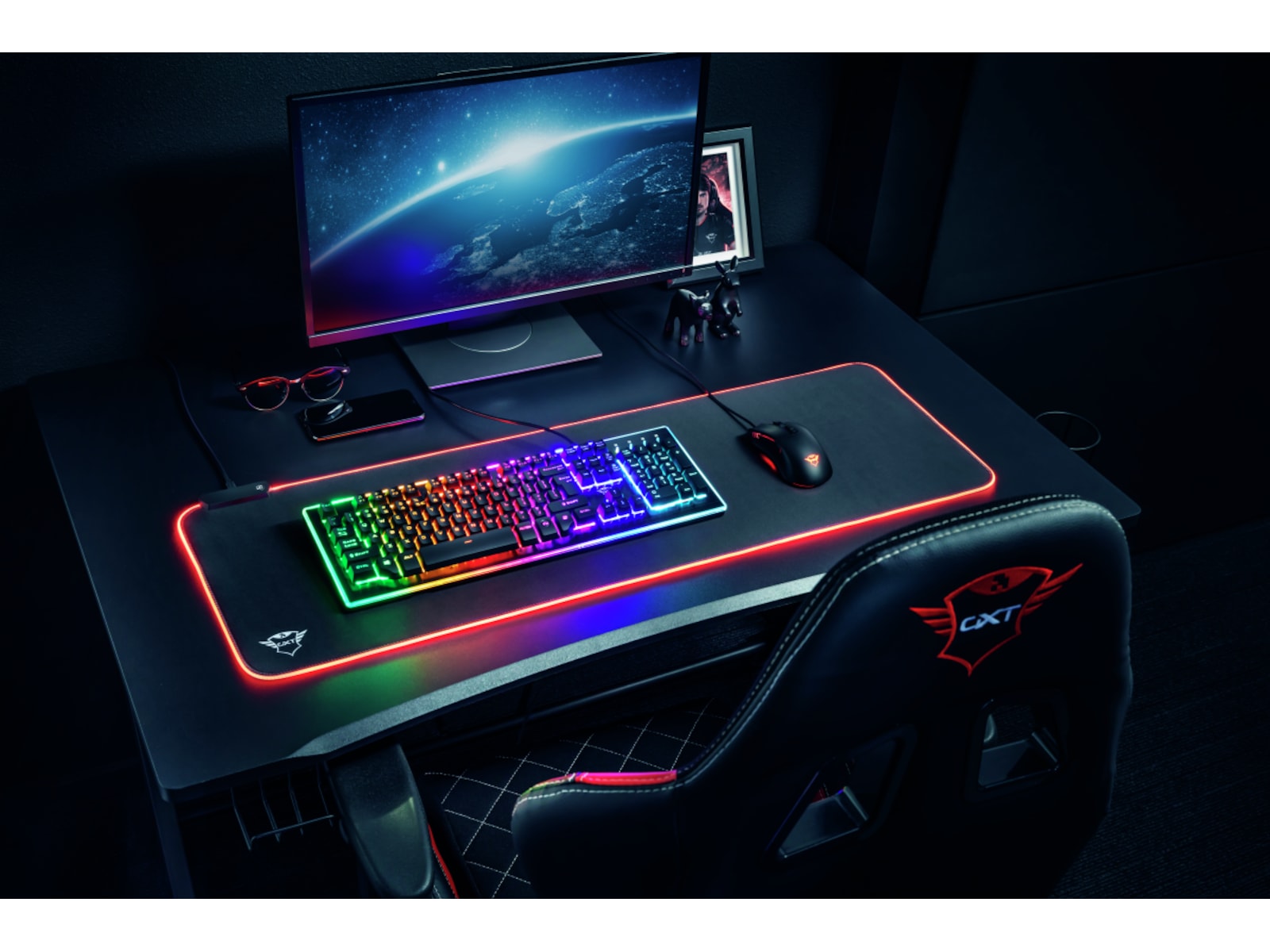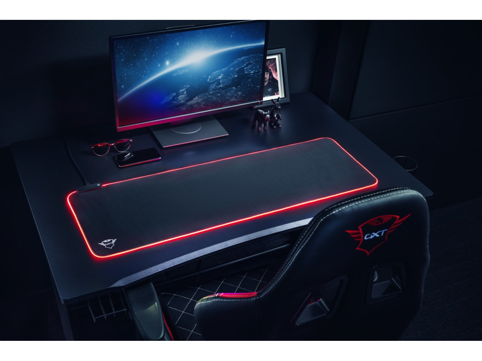 Med sit ekstremt store design, komfortable stofoverflade og RGB LED-oplyste kanter kombinerer Trust GXT 764 Glide-Flex XXL RGB-musemåtten alle funktionerne, så du kan starte din vinderserie.