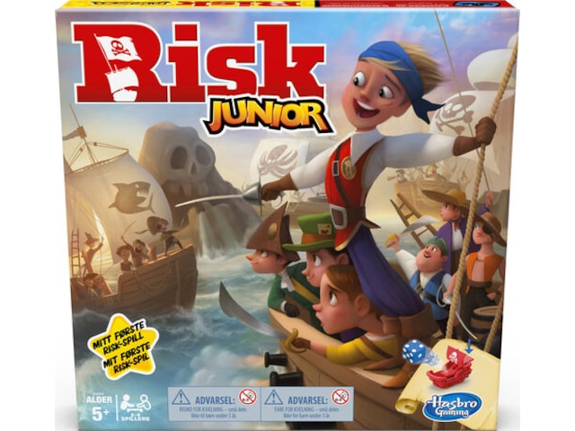 Risk Junior-brætspillet er nemt at spille, har et engagerende pirattema og farverige illustrationer. Børn flytter deres skibsbrik rundt på spillepladen på jagt efter begravede skatte, mens de kæmper om kontrollen over øerne og forsøger at plyndre så meget som muligt for at vinde. Du behøver ikke kunne læse for at spille, det sættes hurtigt op og kan spilles på under 30 minutter.
