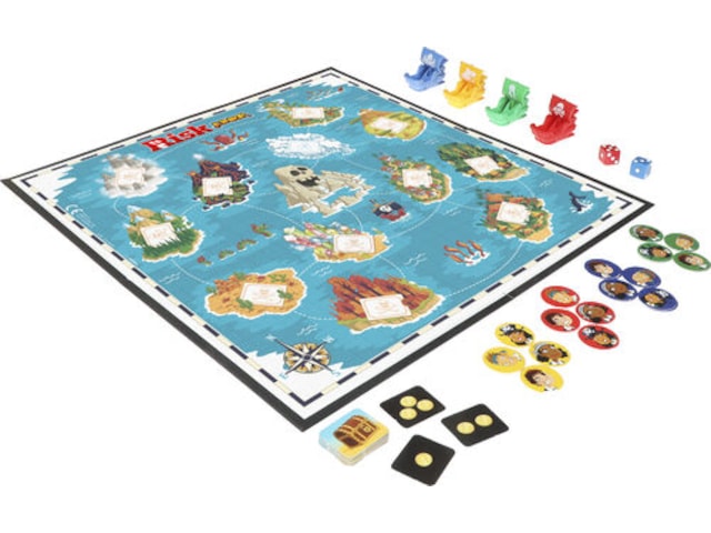 Risk Junior-spillet har et pirattema, der giver børn mulighed for at bevæge sig rundt på sørøverskibs-brikker, mens de kæmper om skatte og kontrol over øerne