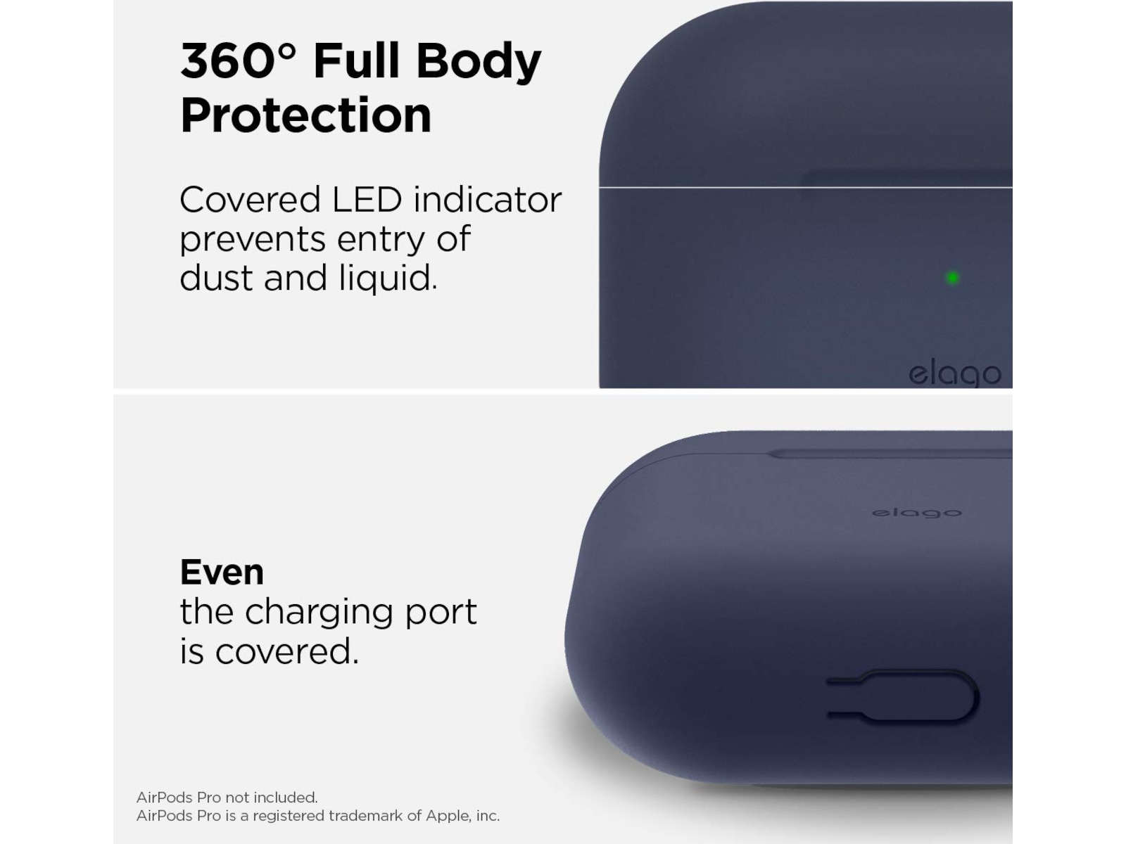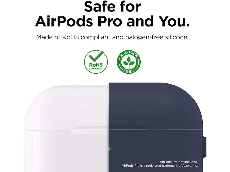 BESKYTTELSE Etuiet er fremstillet af førsteklasses silikonemateriale for at beskytte dit AirPods Pro etui mod ridser og eksterne påvirkninger. Støvhætte beskytter AirPod Pros opladningsport mod støv og væsker. En karabinhage er inkluderet, så du sikkert kan fastgøre dit AirPods etui til bæretasker, kufferter, bukser, osv