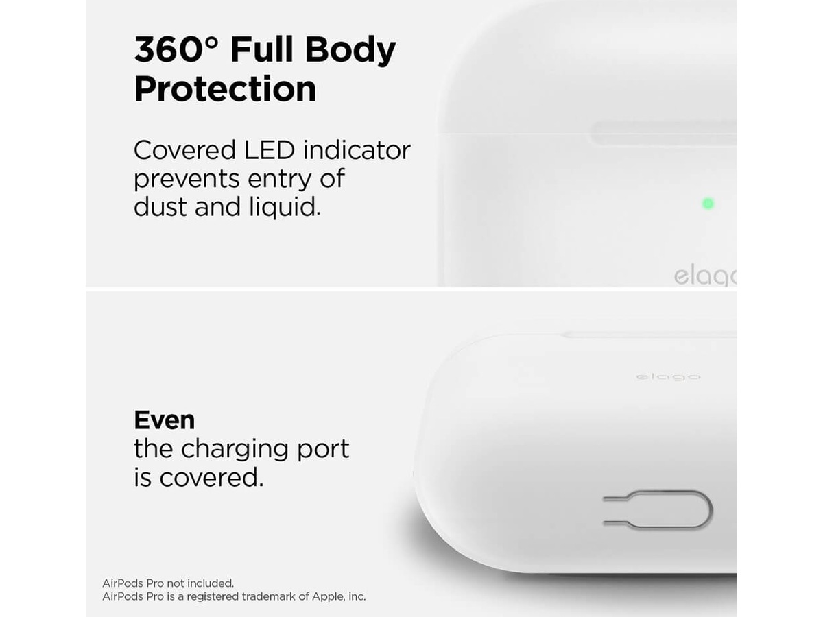 BESKYTTELSE Etuiet er fremstillet af førsteklasses silikonemateriale for at beskytte dit AirPods Pro etui mod ridser og eksterne påvirkninger. Støvhætte beskytter AirPods Pros opladningsport mod støv og væsker.