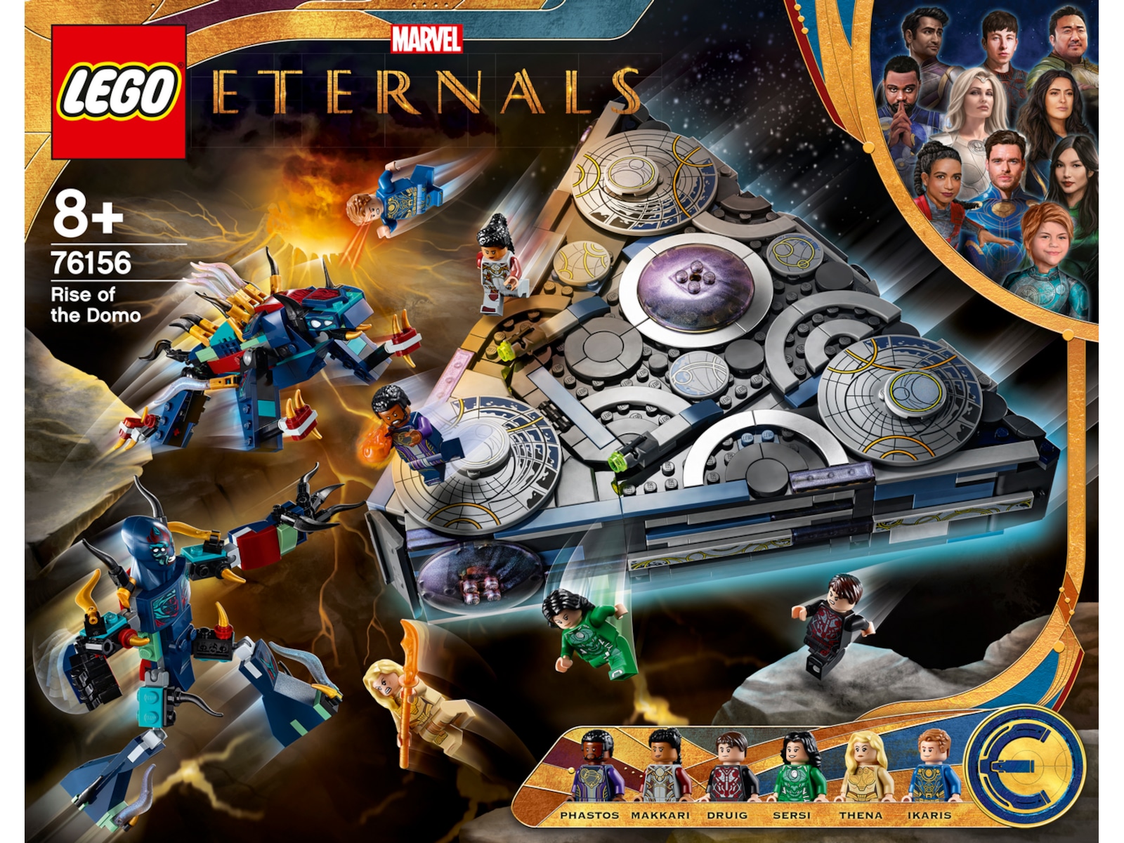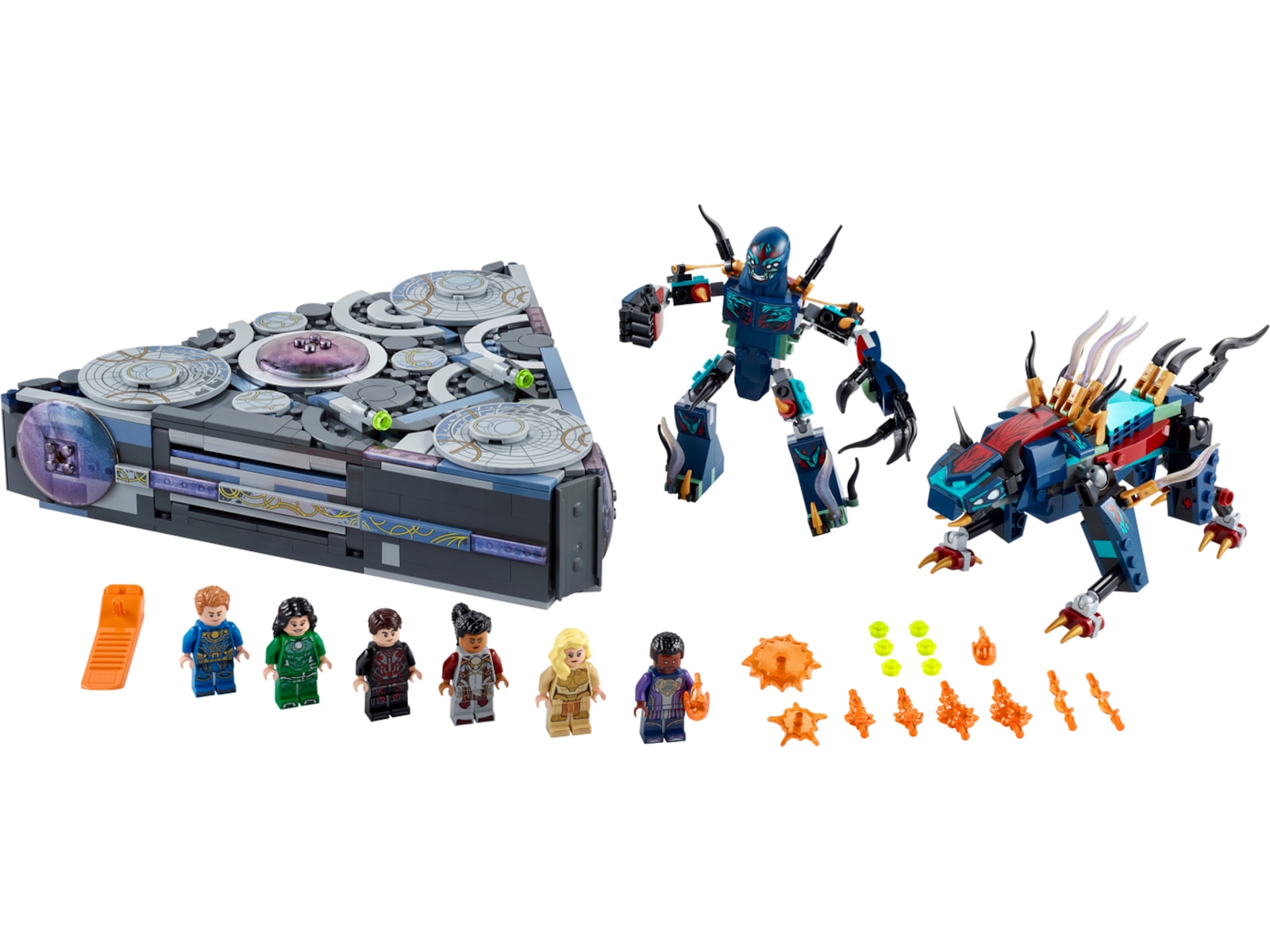 - Indeholder 6 minifigurer – Makkari, Ikaris, Thena, Sersi og de eksklusive Druig og Phastos – 2 deviant-actionfigurer, bl.a. Kro, devianternes leder, et rumskib, våben og tilbehør.
