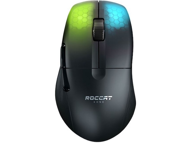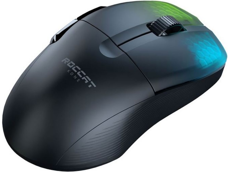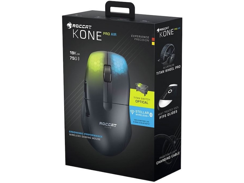 Mød ROCCAT® Kone Pro Air Ergonomic Optical Performance Wireless Gaming Mouse med RGB-belysning, den første trådløse Kone nogensinde. Perfektioneret gennem 14 års håndværk pg på kun 75 g er Kone Pro Air let, behagelig og avanceret. Den bruger Titan Switch Optical, AIMO RGB-belysning, vores 19K DPI Owl-Eye-sensor, USB-C PhantomFlex™-opladekabel og varmebehandlede glidere.