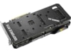 Undersiden af kortet afslører en række forbedringer. Det meste af bagsiden er skåret i en beskyttende metalbagplade, der gør sig bemærket med en bred udluftning. Udluftningen tillader, at varm luft slipper ud mod chassisets udstødningsventilatorer i stedet for at blive genanvendt tilbage i GPU-køleren. Rustfri stål bruges til I/O-beslaget for at beskytte porte og give en mere sikker montering. En praktisk placeret Dual Bios-switch muliggør tilpasning af kortets standardydelsesprofil uden software.