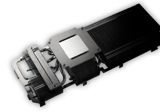 Varmesprederen trækker varmen op i varmeledninger, der fører den gennem en finnestak, der fylder det meste af kortets store fodspor på 2,7-slot.