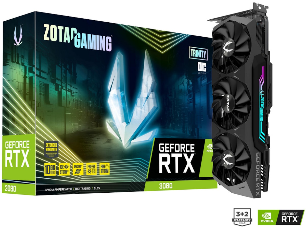 | Video adapter egenskaber | NVIDIA Tensor Core, Active Fan Control, Nvidia DLSS, Nvidia RT Core, Freeze Fan Stop, Metal wraparound-bagplade, LHR (Lite Hash Rate), 2.5-slot Fan Cooler, SPECTRA 2.0 Lighting System, IceStorm 2.0, NVIDIA Ampere GPU-teknologi, Real-Time Ray Tracing |