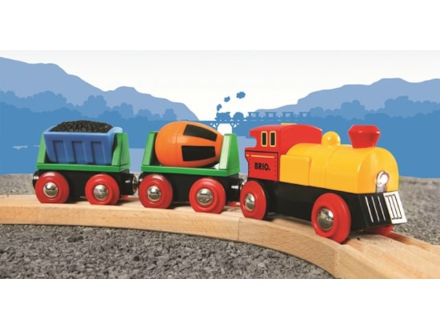 Du kan få meget sjov ud af det her batteridrevne togsæt med bevægelig kulvogn, roterende cementblander og lysende forlygter på lokomotivet.