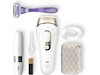 Med 4 ekstraudstyr: præcisionshoved, ansigts-minishaver, Venus swirl-shaver, premium beauty-pose.