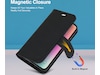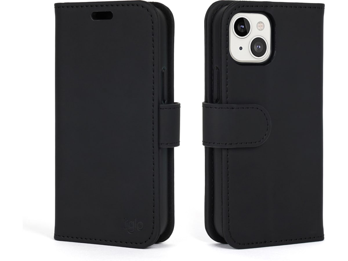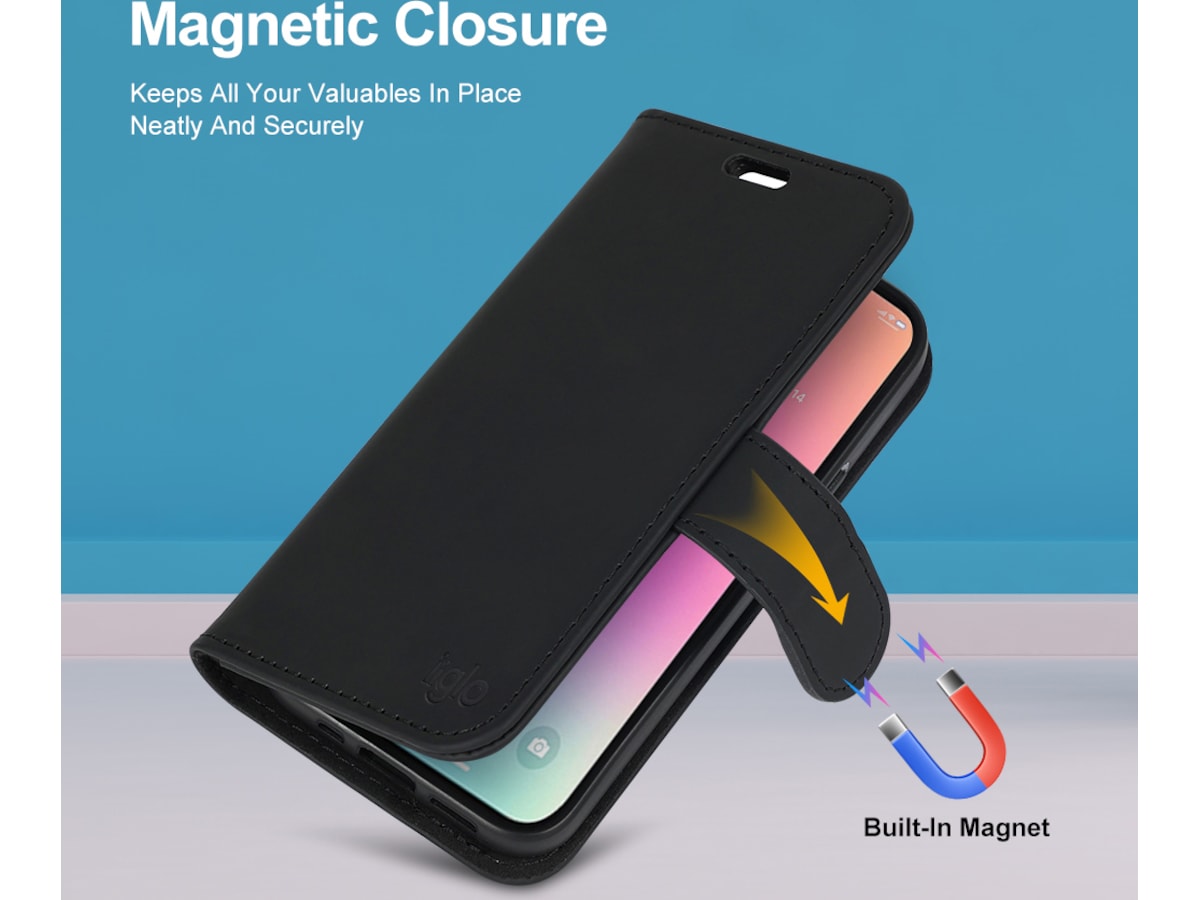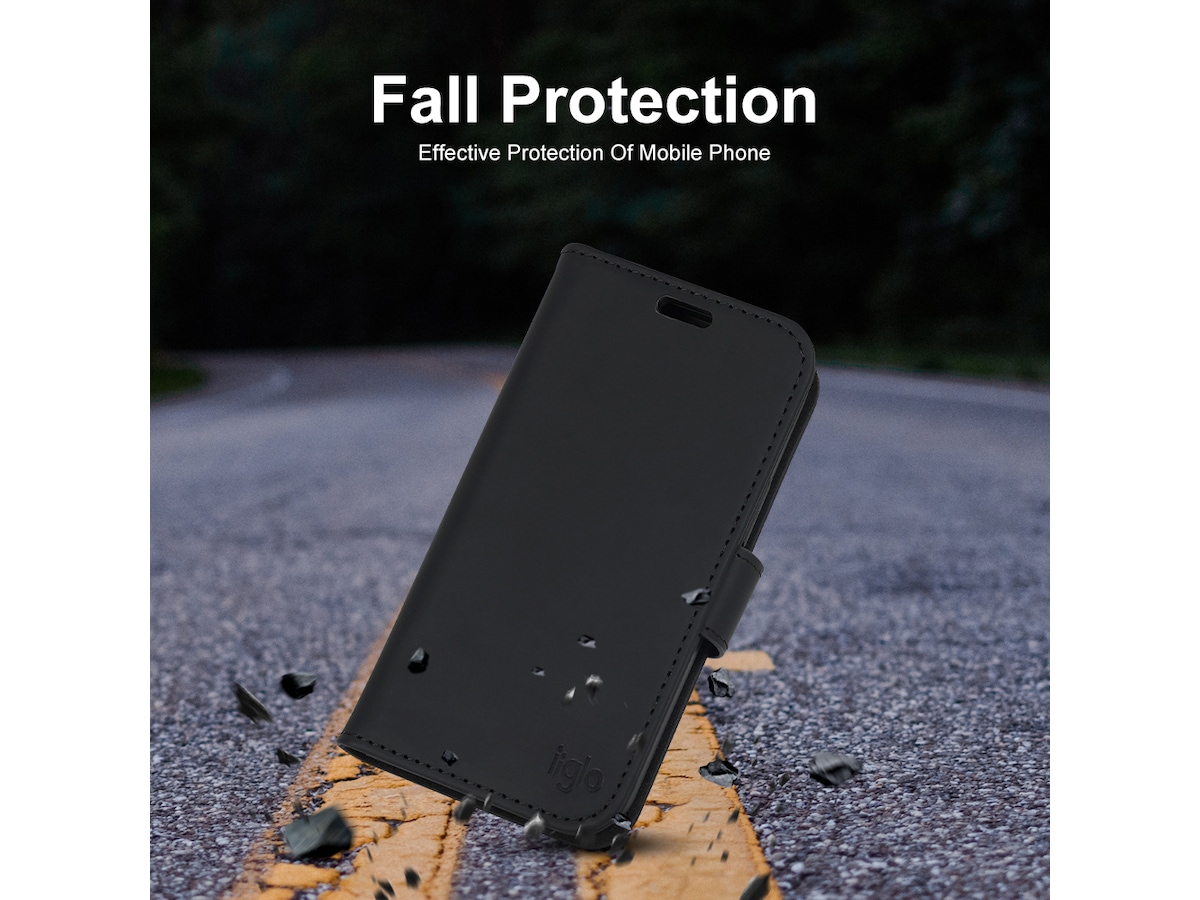 Beskyt din iPhone med iiglo iPhone-tegnebogsetui i sort design Dette etui er lavet af førsteklasses PU-læder, der er et blødt og slidstærkt materiale. Etuiet beskytter mod stød og ridser. Den magnetiske strop sikrer, at etuiet lukkes, selv når telefonen er i jakkelommen eller PC-tasken.