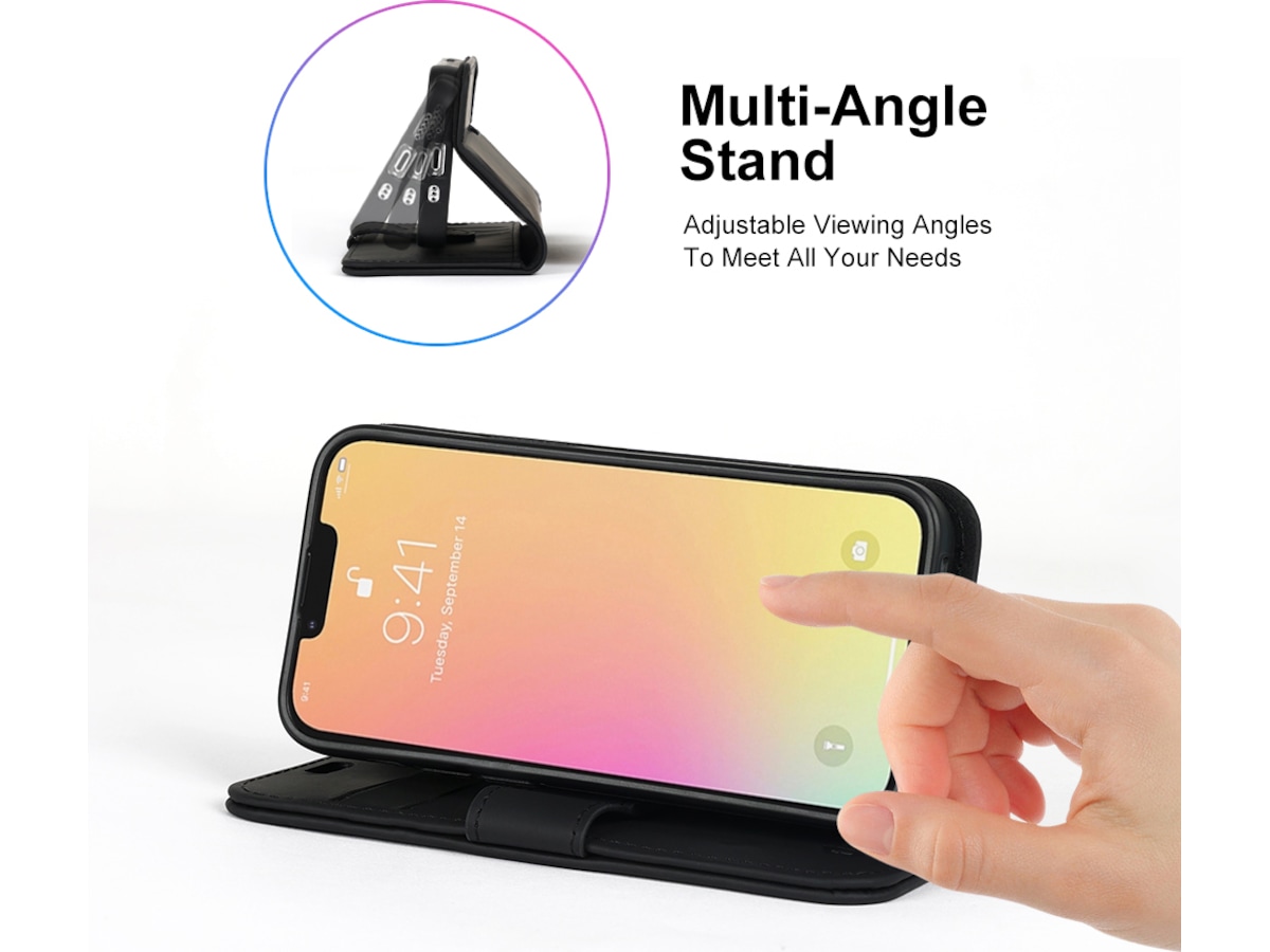 Etuiet er meget let og giver god holdekomfort, når du bruger din iPhone. Fronten kan foldes til et stativ, så du kan se film eller deltage i videomøder i en perfekt vinkel! Etuiet har en lomme til tre kort. Selv med praktiske løsninger er der ikke gået på kompromis med designet, som er sort, enkelt og stilfuldt.