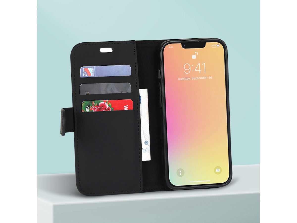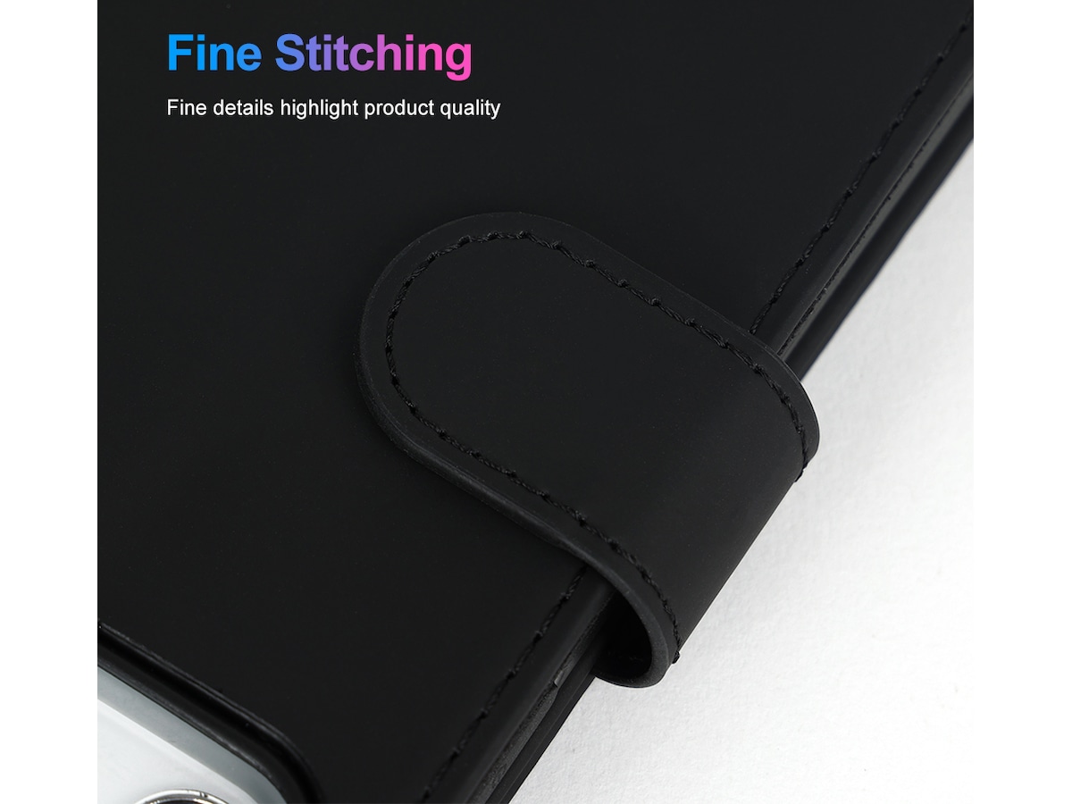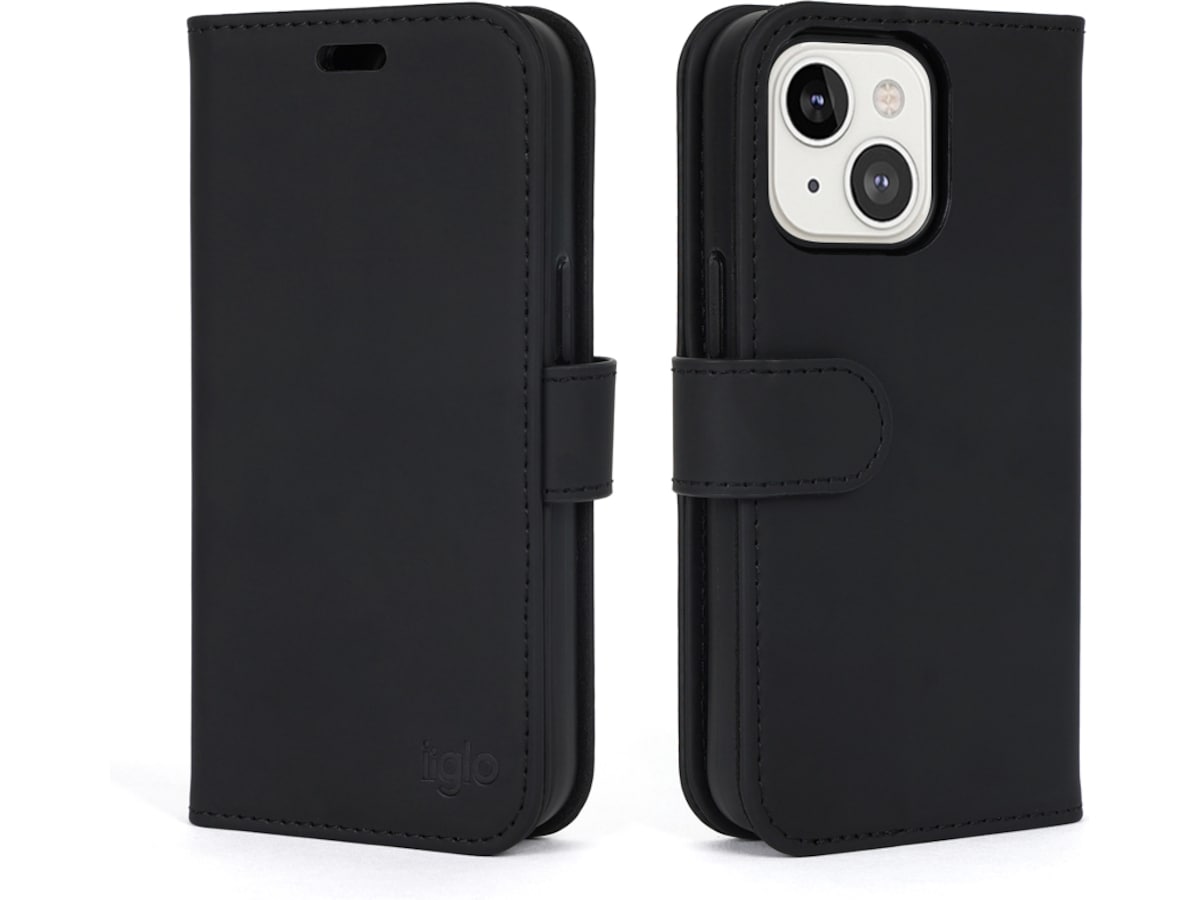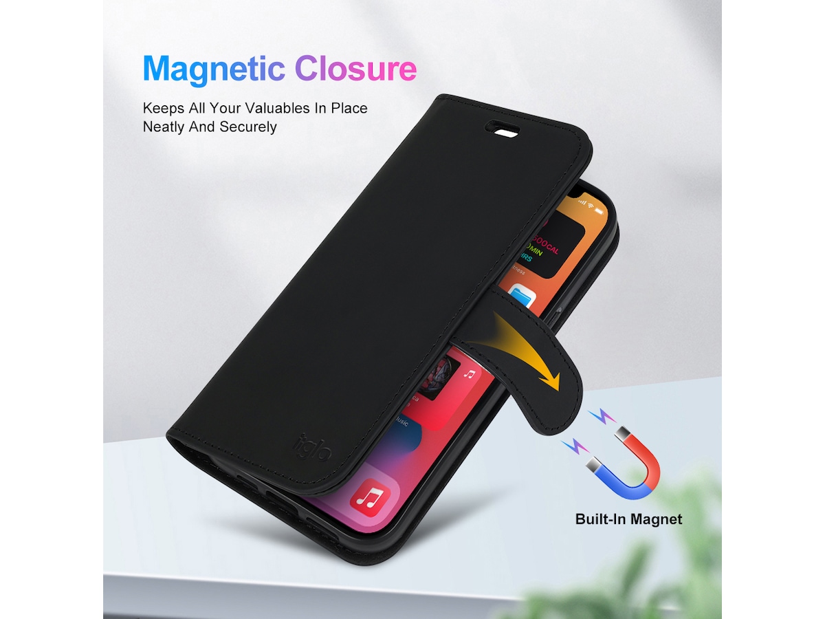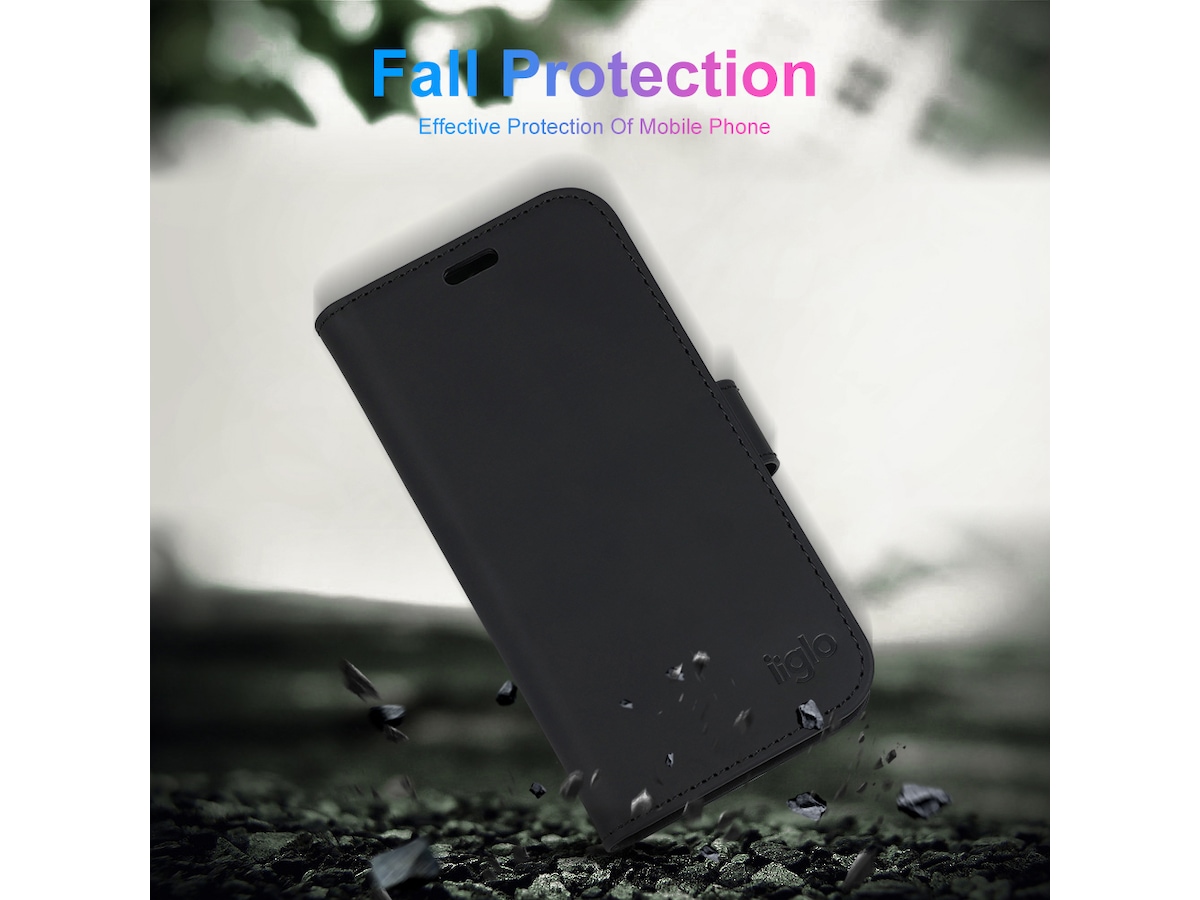 Beskyt din iPhone med iiglo iPhone-tegnebogsetui i sort design Dette etui er lavet af førsteklasses PU-læder, der er et blødt og slidstærkt materiale. Etuiet beskytter mod stød og ridser. Den magnetiske strop sikrer, at etuiet lukkes, selv når telefonen er i jakkelommen eller PC-tasken.
