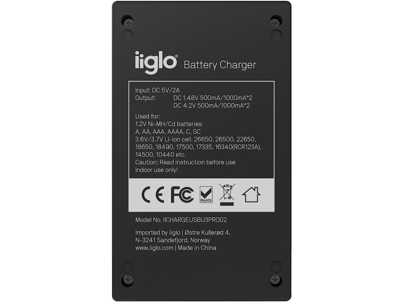 iiglo USB-batterioplader kan oplade 2 batterier samtidigt. Dens Micro-USB-kabel giver dig mulighed for at oplade batterier via vægoplader, powerbank og biloplader.