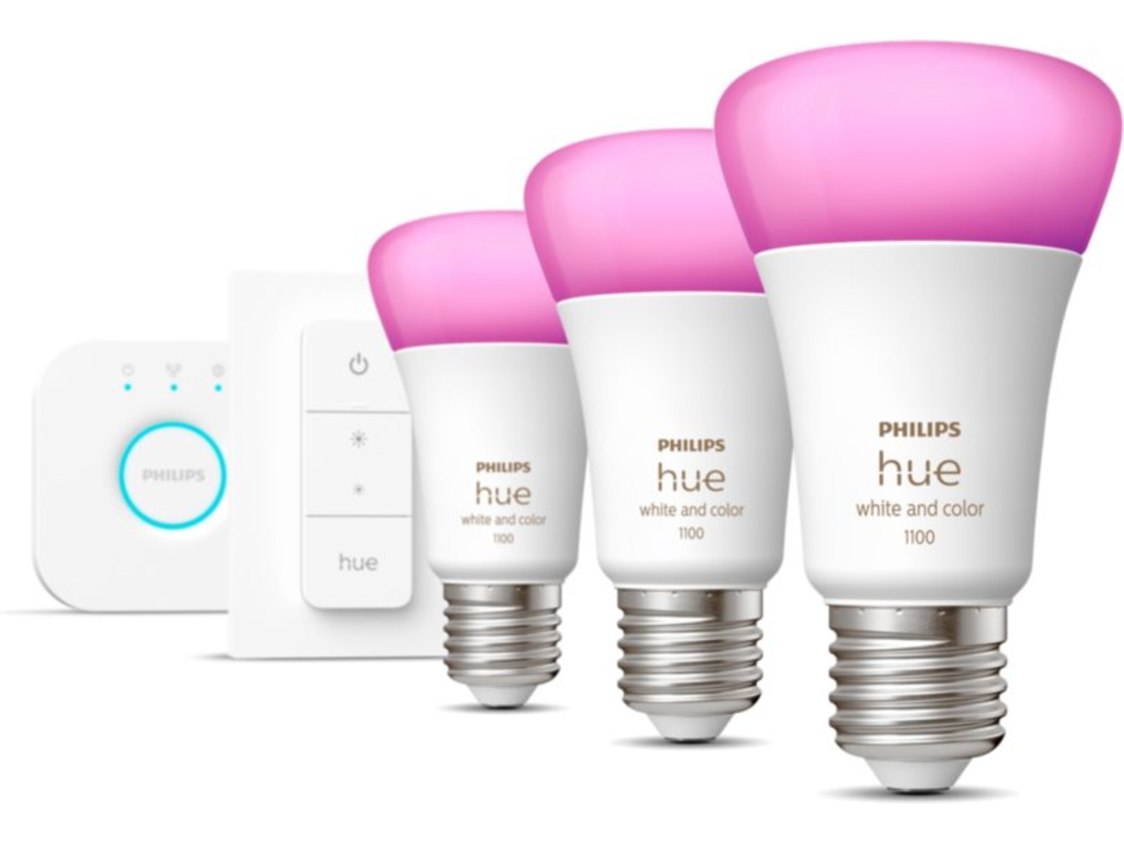 Dette Philips Hue White and color ambiance startsæt indeholder tre E27 pærer, en Hue Bridge og en Dimmer switch, der fungerer både som trådløse vægkontakter og fjernbetjeninger.