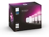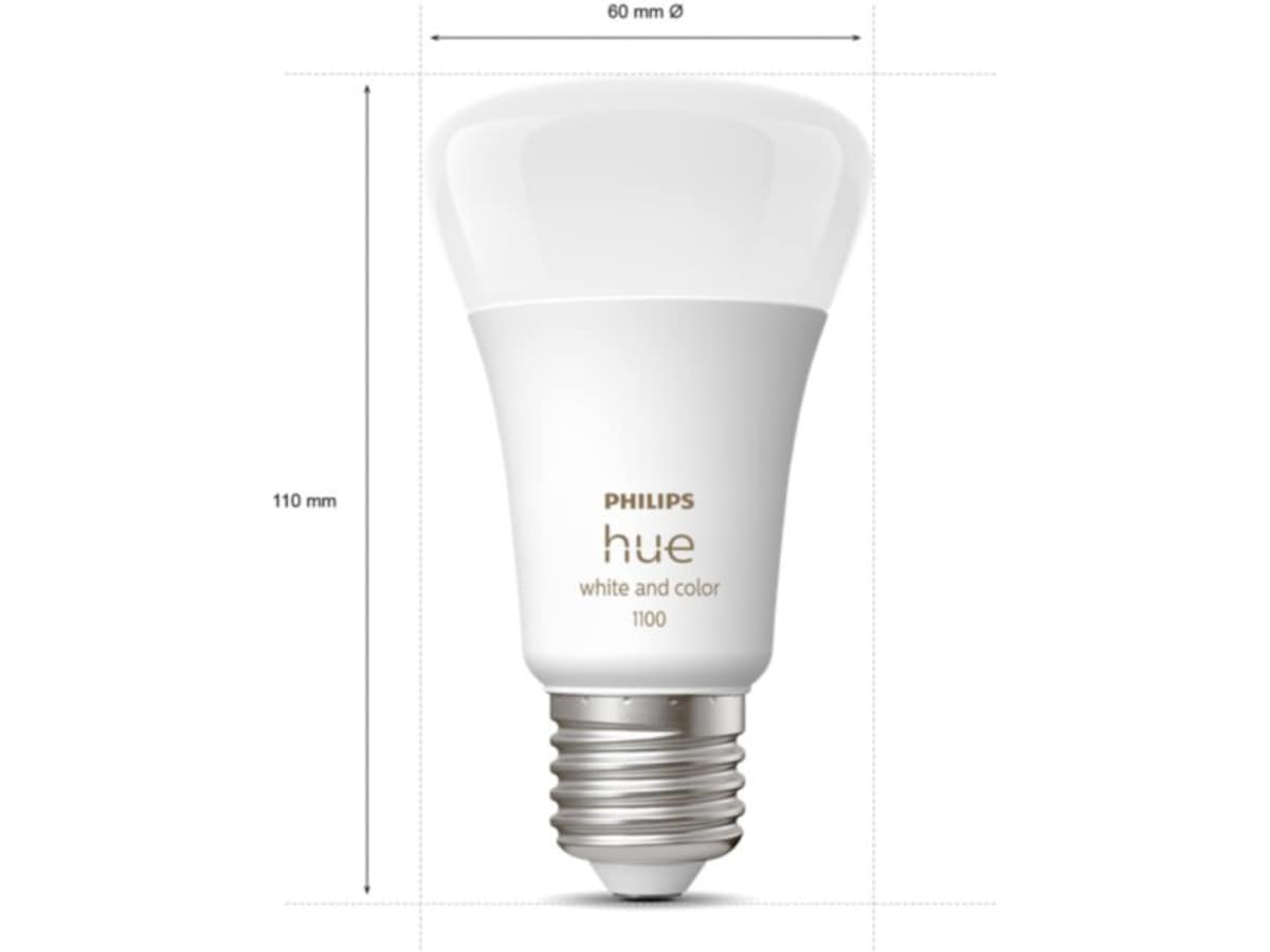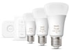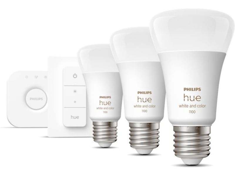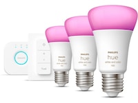 Dette Philips Hue White and color ambiance startsæt indeholder tre E27 pærer, en Hue Bridge og en Dimmer switch, der fungerer både som trådløse vægkontakter og fjernbetjeninger.