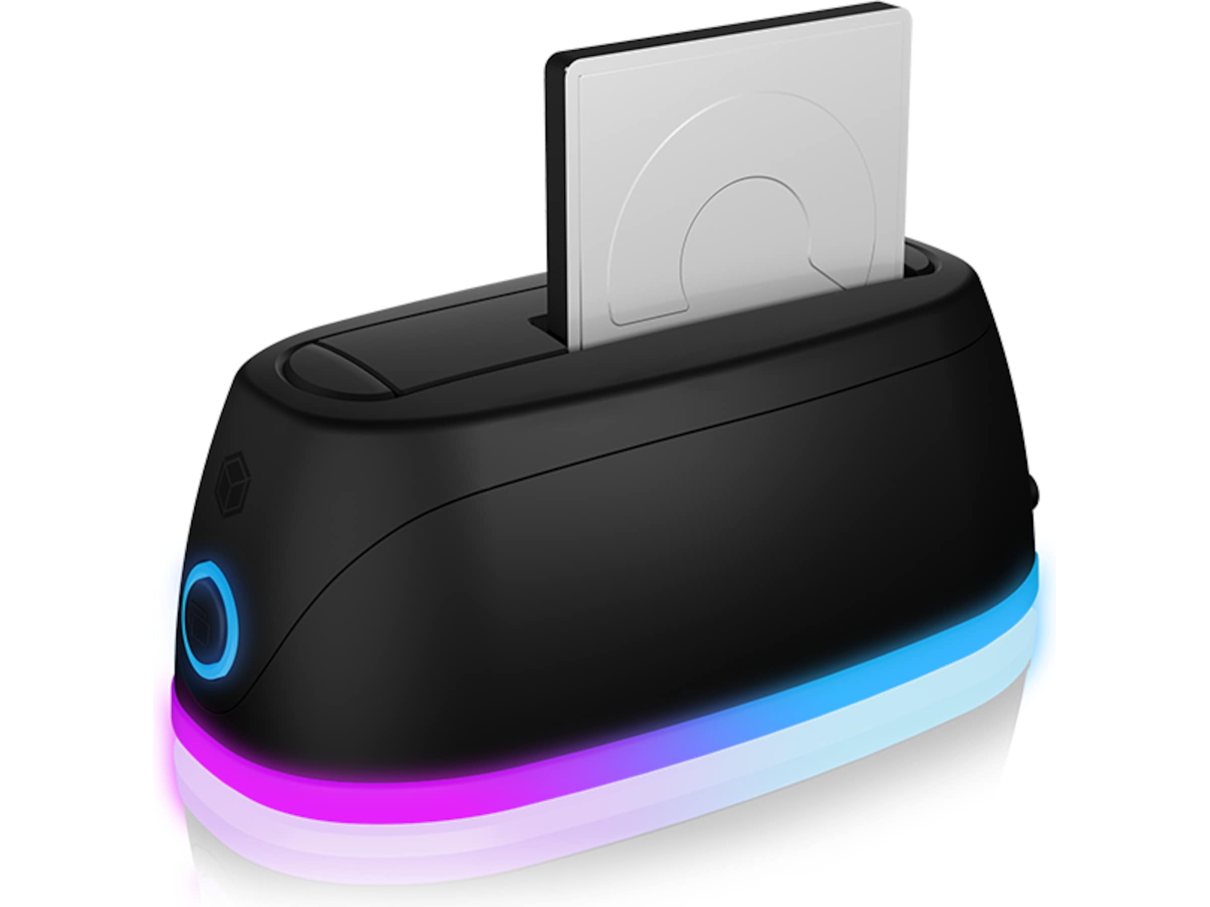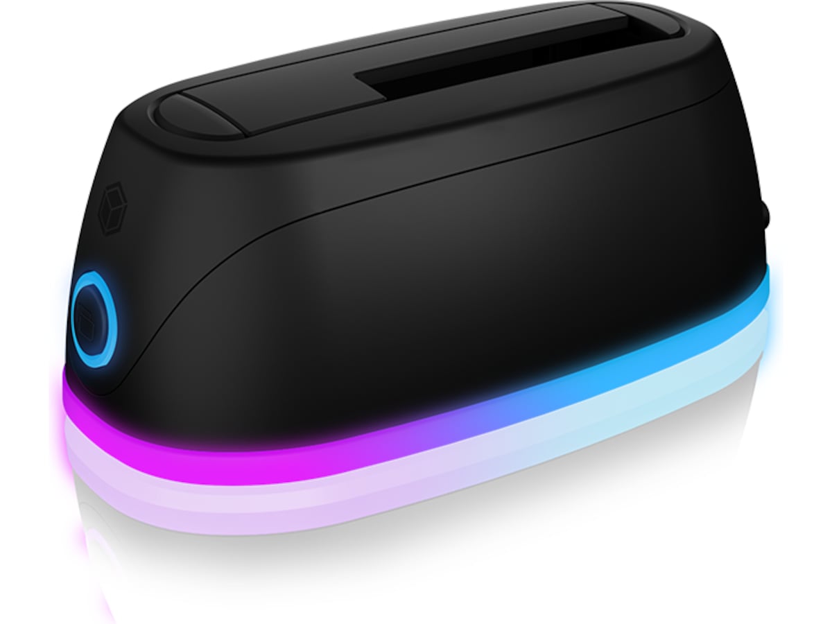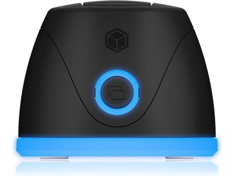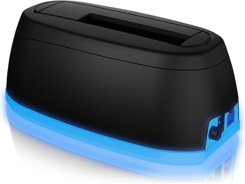 Den omgivende belysning strækker sig én gang rundt om kabinettet som en blå stribe. Den blå cirkulære LED har ikke kun en visuel effekt, men indikerer også drift og adgang til harddisken. Denne DockingStation komplementerer dit kontor eller hjemmekontor som et teknisk pålideligt designobjekt.