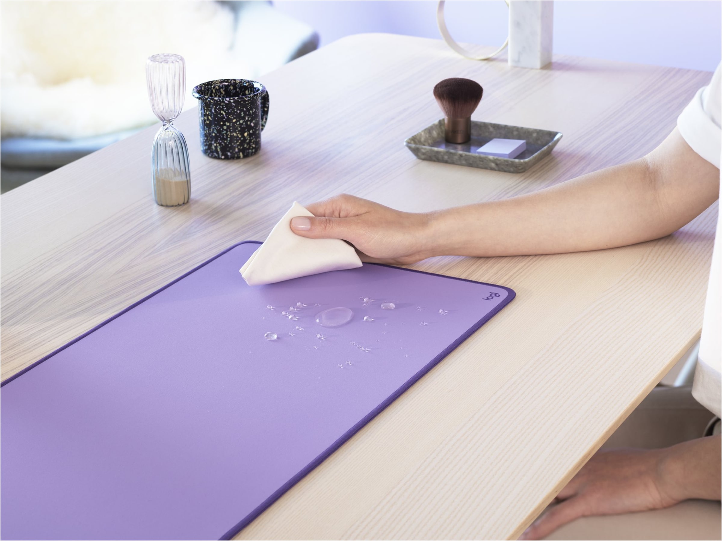 Logitech Desk Mat har en spildsikker belægning, der kan modstå mindre ulykker, og væske kan nemt tørres af med en fugtig klud.