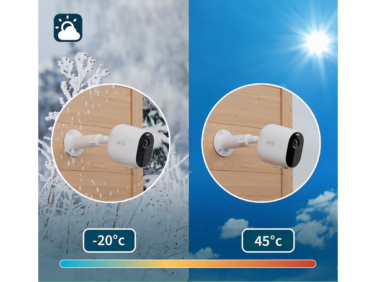 Regn-, sol-, vind- og snebestandig. Vores superstærke polycabonat-kabinet - det samme materiale, som bruges i skudsikkert glas - betyder, at dit kamera kan fungere i temperaturer fra -20°C til 45°C.