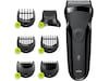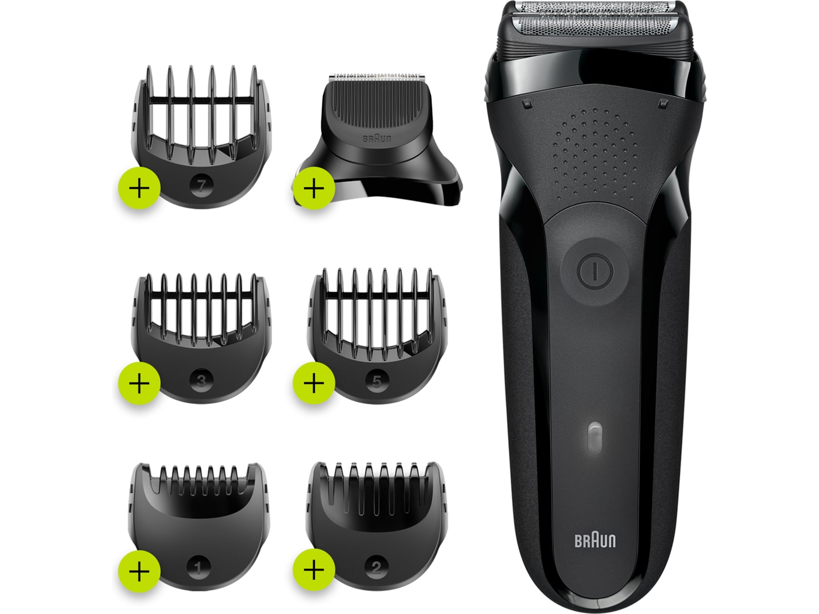 Denne alsidige enhed har tre trykfølsomme barberingselementer til barberingseffektivitet og hudkomfort, et skægtrimmerhoved og fem kamme til pleje af skæg og stubbe på 1-7 mm.