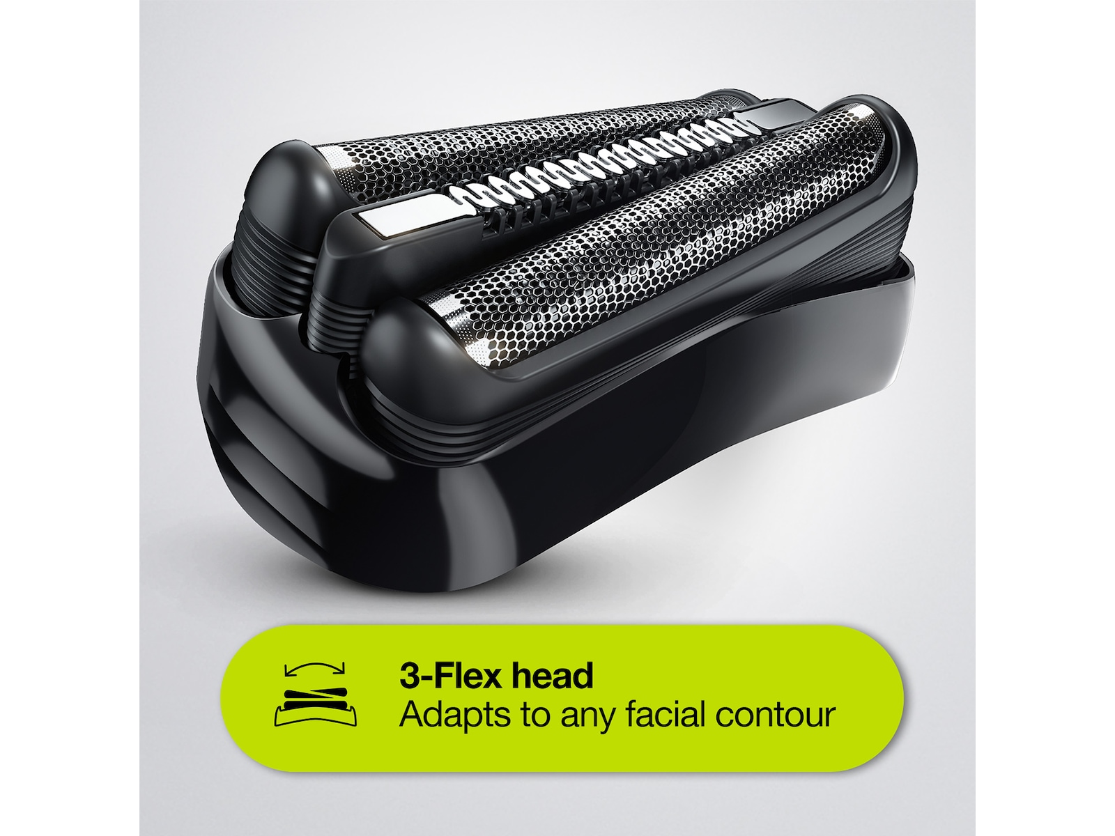 - Inkluderer 3-Flex-hoved til effektivitet og hudkomfort, et skægtrimmerhoved og fem kamme.