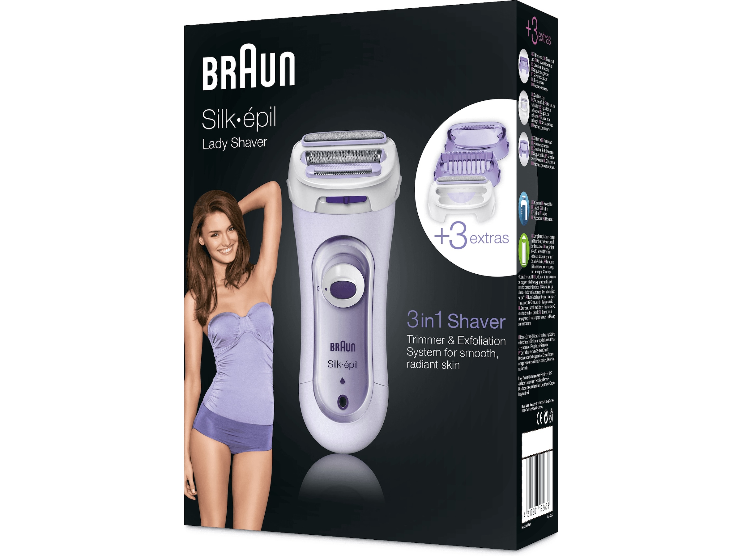 • 3 tilbehørsdele: trimmerhætte til bikinilinje og sarte områder, eksfolieringsdel, glidehætte