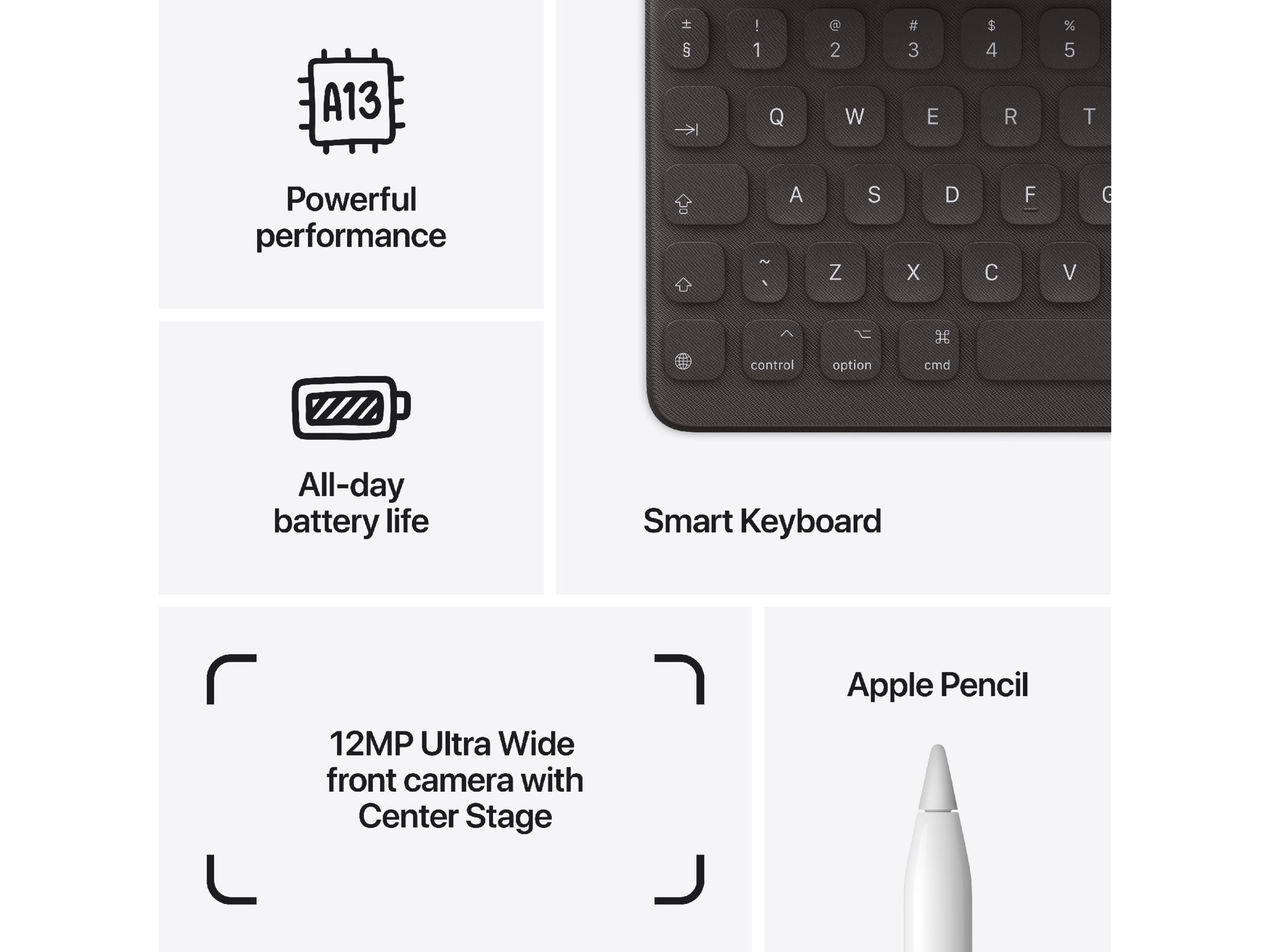 Kraftfuld. Let at bruge. Alsidig. Den nye iPad har en fantastisk 10,2-tommer Retina-skærm, en kraftig A13 Bionic-chip, ultravidvinkel og fokuseret frontkamera, og den fungerer med Apple Pencil og Smart-tastaturet.¹