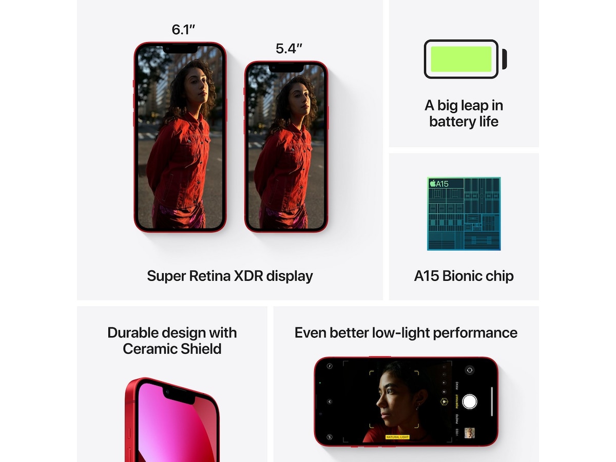 iPhone 13 mini. Det mest avancerede system med to kameraer nogensinde på en iPhone. Lynhurtig A15 Bionic-chip. Et spring i batterilevetid. Holdbart design. Superhurtig 5G.¹ Og en lysstæk Super Retina XDR-skærm.